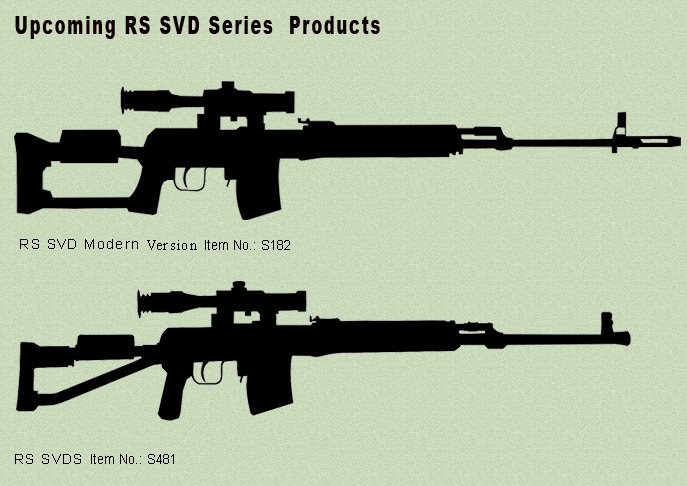 Ano.Toto SVD AEG jsme společně s firmou Taiwangun zadali do výroby u Firmy A&K,která vyrábí repliky P&J. Jako základ jsme dodali SVD od CA. Tyto budou s plastovým pažbením,později necháme opět vyrobit dřevěné pažbení. Co se týče SVD AEG,které jsme společně s firmou Taiwangun nechali vyrábět podle námi dodaných několika kusů SVD od Real Sword, tak ty již zřejmě připluly a tento týden se již budou vykládat,spolu se zásilkou zbraní firmy CYMA. Tento Dragunov má již od výrobce dřevěné pažbení,podle námi dodaných vzorů. Takže,kdo bude chtít SVD s dřevěným pažbením,podle R.S. bude mít možnost již asi tento týden, Kdobude chtít kopii podle CA v plastu,bude si muset jěště chvíli počkat.