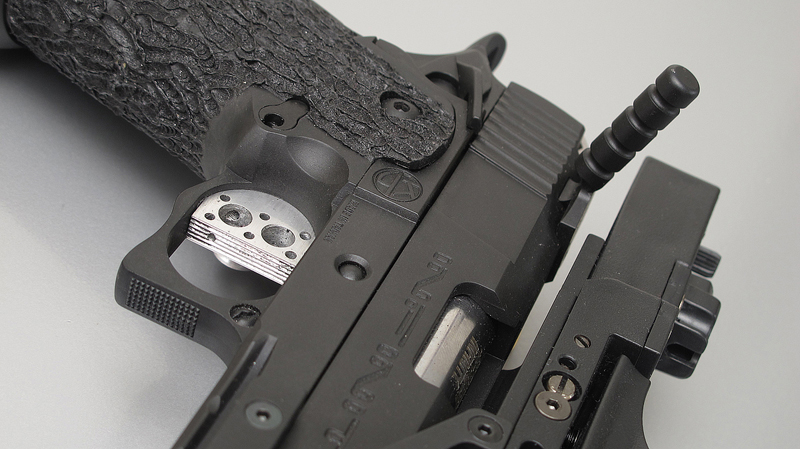 TM Hi-capa 5.1 - Limcat custom Gunsmith - Mike Cripps - EnglandZáver - ProHandgun Limcat Wildcat custom 6" + kompenzátor + oceľová vonkajšia hlaveň Rám - Tokyo Marui Hi-capa 5.1 čierna so striebornými ovládacími prvkami Elite Custom - 6" nerezová vnútorná hlaveň 6.02 mm ProHandgun duralová nastaviteľná spúšť - odpor 0,9 kg ProHandgun oceľové kladivo STI style magwell AIP loading nozzle NineBall HopUp AIP Blowback light unit Guarder springs 150% C-more replika AIP carbon montáž na optiku Elite Custom grip duralová naťahovacia páka hammer plate (ochrana záveru pred odtlačením od kladiva) duralový thumb rest AIP magazine bases - duralové - strieborné Skrátený chod záveru - short stroke buffer