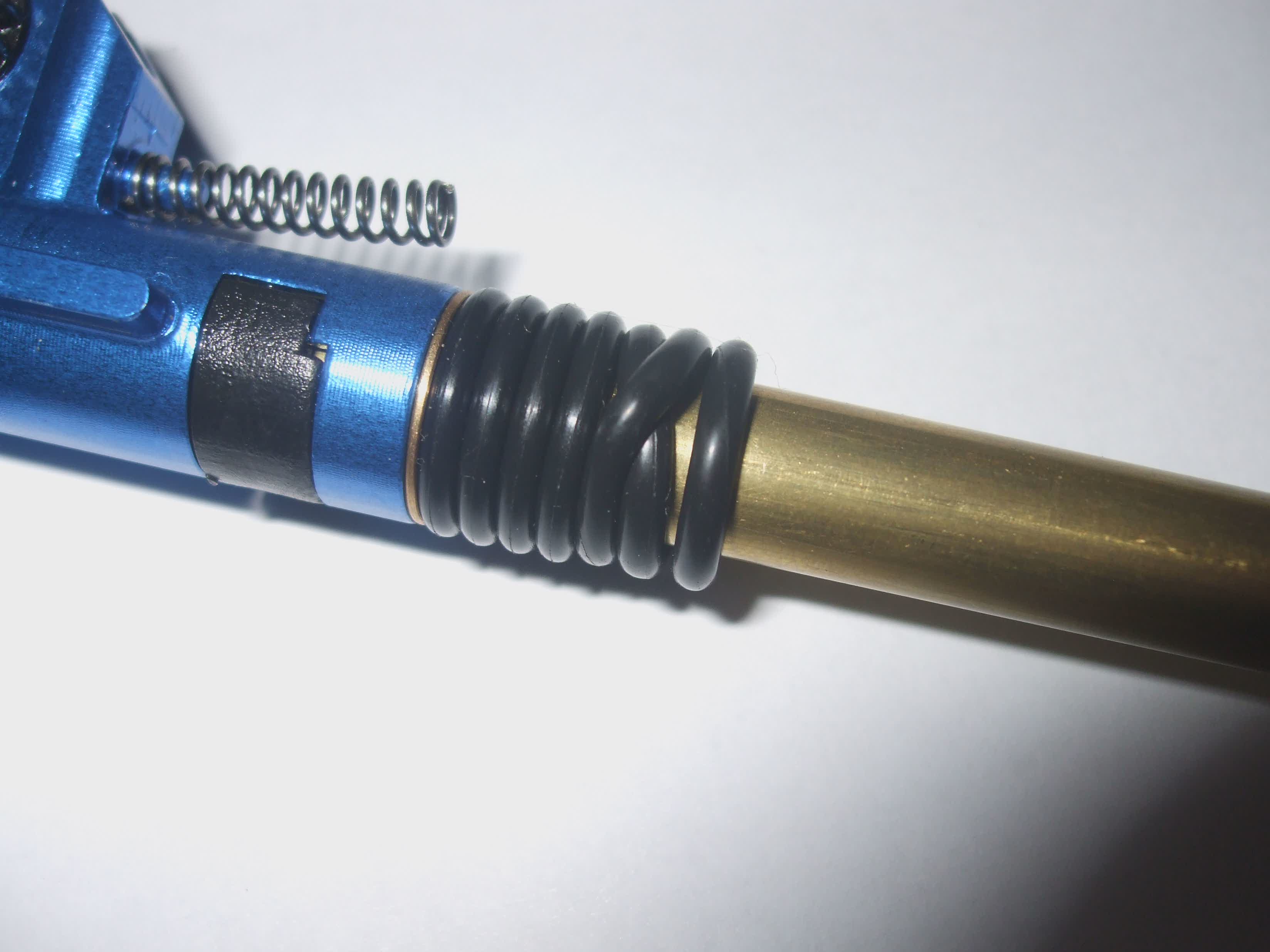 -Ke komoře jsou dodány jen 4 o kroužky a komora stále odskakovala, kroužků bylo málo, v dílně jsem o kroužek takových rozměru nenašel, proto jsem použil o kroužek pro hlavu pístu a okolo hlavně jí 3* omotal.