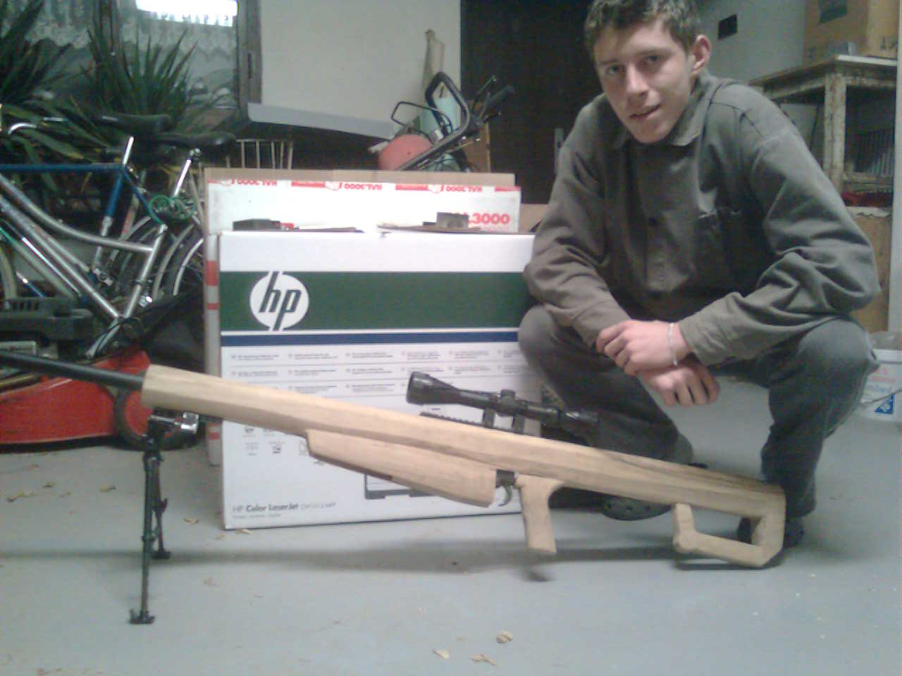 j tělo je ze dřeva(ořech) díky tomu že se učím truhlářem, mam oba rodiče truhláře, a místo do školky jsem si chodil hrát do dilny tak to byla celkem hračka, ale chce to HODNĚ pevny nervy, trocha zručnosti a hafo času na dodělávky, mam doma takový kutilky doupě v dilničce+truhlářska dilna taky napomohla ale tam jen navrtání díry na prostrčení hlavně ... jinak žádná frézka, žádná pilka, žádná bruska nic .... vše nařadím na ruční pohon  to co jsem měl nazačátku byla fošna 1200x250x60 ale po několika "zajimávých" nazorech si nepřipadám že bych vynikal výrobou ale nápadem a tím že jsem to zrealizoval