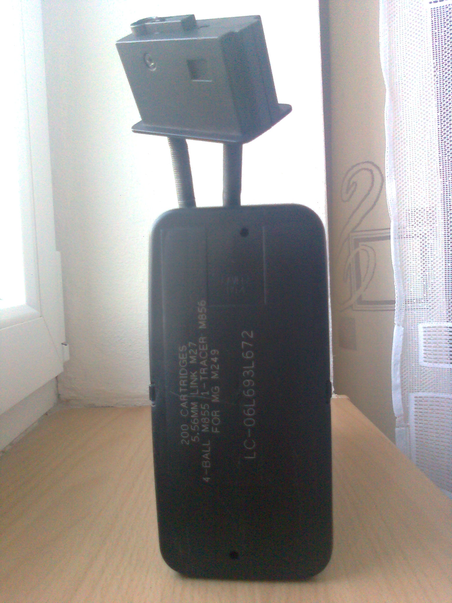Koupil jsem na Aukru M249 MK2. Dostal jsem k němu zvláštní černý zásobník. Běžně je v oliv a ze spodu jsou popisky u vypínače. Já mám zespodu jen vyříznutou díru pro vypínač a dvě vyvrtané díry. Je z velmi kvalitního plastu. Na víku jsou popisy. Uvnitř na steně zásobníku je imitace náboje 5,56x45 podobně jako u PMAGu. Vnitřní mechanismus v něm pořádně nedrží, musel jsem to dost upravovat. Přikládám fotky, bohužel v horší kvalitě...