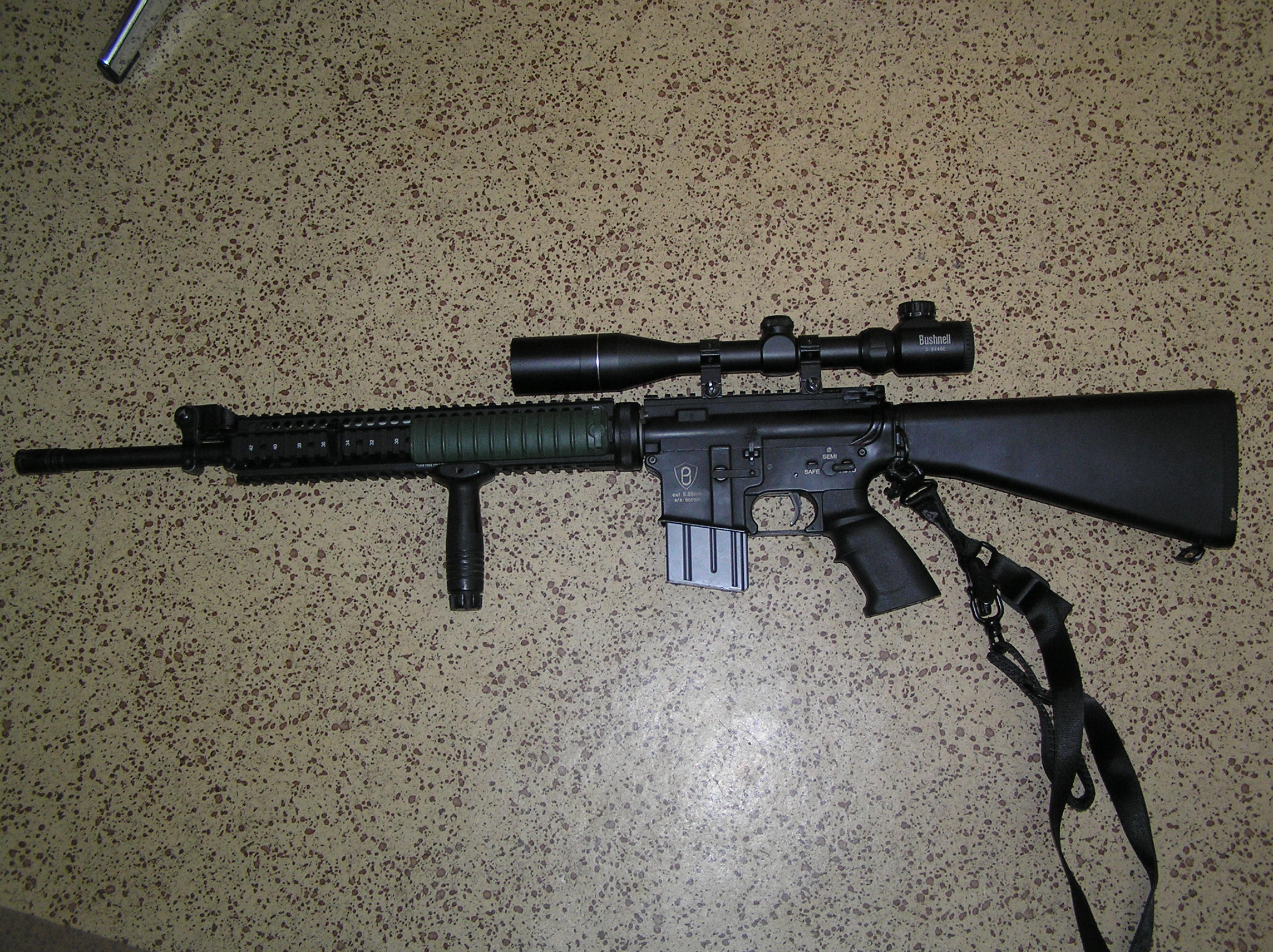 Základová zbran - PJ M16A3 Mechabox - X high-tech 9mm Vzduch komplet - airsoftpro Piest - SHS kovový celozub Kolesá - UFC 100 : 300 Motorček - Systema magnum +"D"pastorok shs Mosfet - APS Batéria - VB power 9,6V 5000mAh občas 10,8V Pružina - GD sp 160 hlaveň - Prometheus 6,03 509mm Hop komora - airsoftpro + systema energy guma. Pouzivam to v podstate ako sharpshooter..a teraz neviem ci mám kúpit kolimátor bipod a bubnový zásobník a mat ztoho nejakú podpornú hovadinu alebo čo, kedže sa bitevné pole pomaly ale isto zaplna aimtop M4kami s 500fps.A to som si chcel kúpiť nejakú peknú optiku alebo spraviť si SAM-R . Tak by som si rád prečítal čo stým..čo vy na to? PS: na tom predpažbí a pevnej pažbe trvám..ta humus náhradná pažbička tam je dočasne tá pojde preč určite