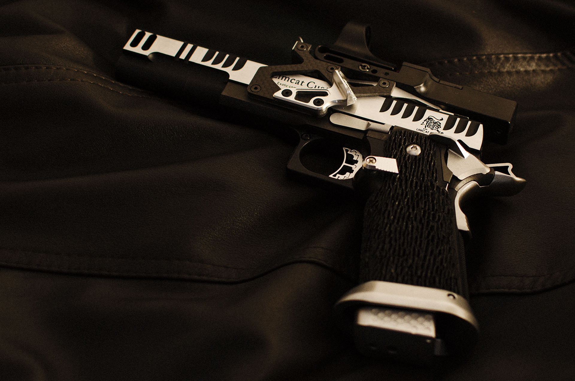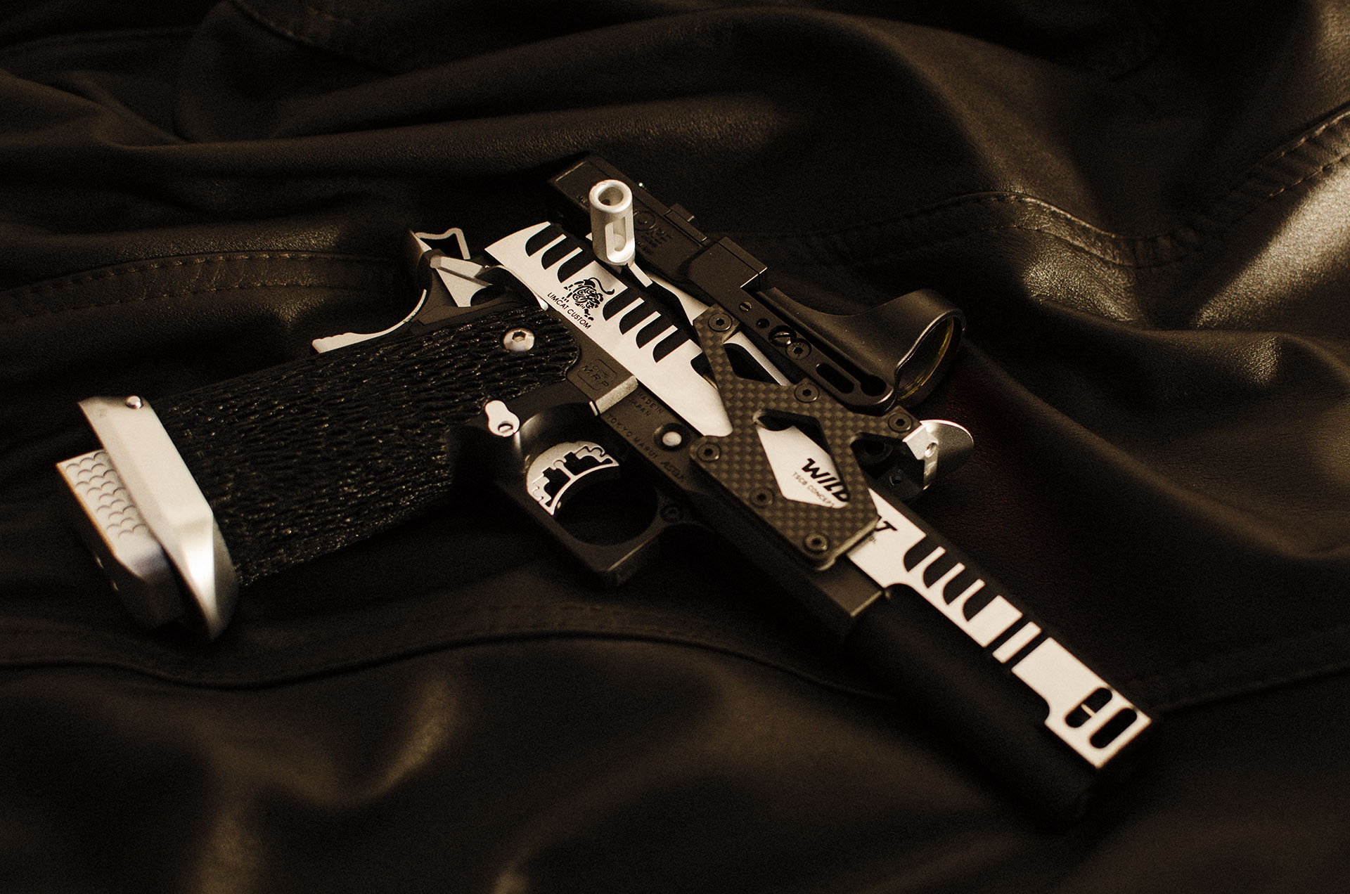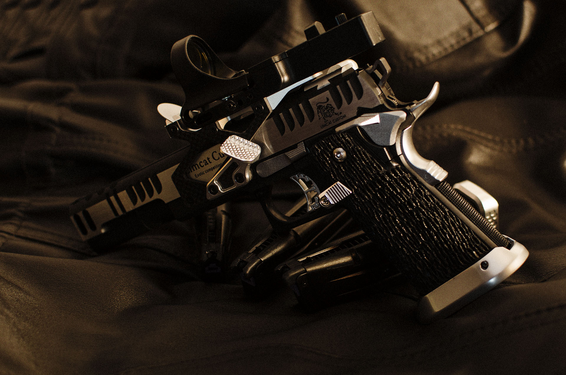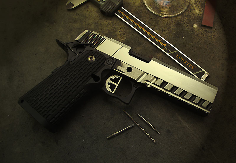 TM Hi-capa 5.1 - Limcat custom Gunsmith - Mike Cripps - EnglandZáver - ProHandgun Limcat Wildcat custom 6" + kompenzátor + oceľová vonkajšia hlaveň Rám - Tokyo Marui Hi-capa 5.1 čierna so striebornými ovládacími prvkami Elite Custom - 6" nerezová vnútorná hlaveň 6.02 mm ProHandgun duralová nastaviteľná spúšť - odpor 0,9 kg ProHandgun oceľové kladivo STI style magwell AIP loading nozzle NineBall HopUp AIP Blowback light unit Guarder springs 150% C-more replika AIP carbon montáž na optiku Elite Custom grip duralová naťahovacia páka hammer plate (ochrana záveru pred odtlačením od kladiva) duralový thumb rest AIP magazine bases - duralové - strieborné Skrátený chod záveru - short stroke buffer