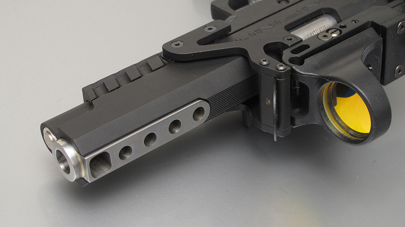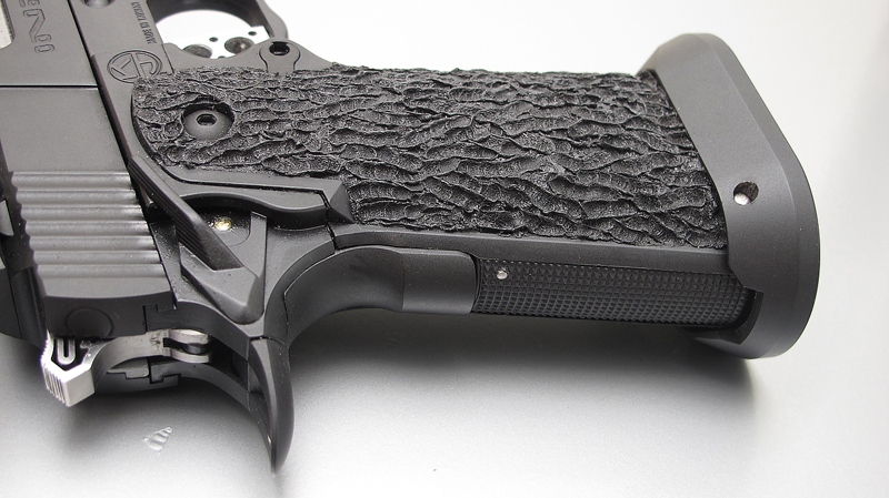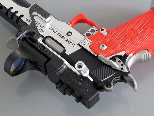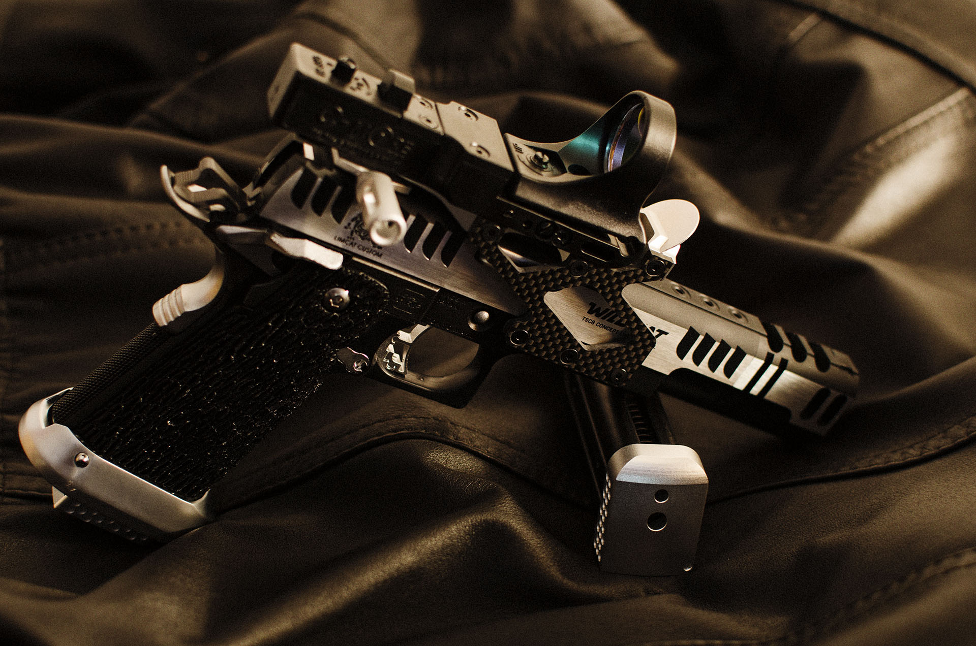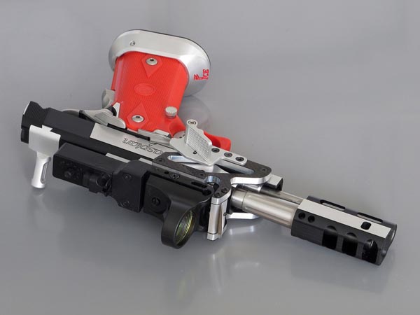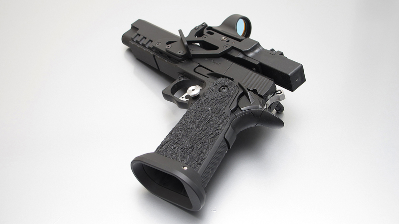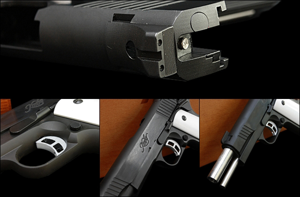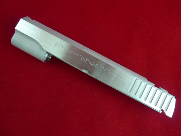 TM Hi-capa 5.1 - Limcat custom Gunsmith - Mike Cripps - EnglandZáver - ProHandgun Limcat Wildcat custom 6" + kompenzátor + oceľová vonkajšia hlaveň Rám - Tokyo Marui Hi-capa 5.1 čierna so striebornými ovládacími prvkami Elite Custom - 6" nerezová vnútorná hlaveň 6.02 mm ProHandgun duralová nastaviteľná spúšť - odpor 0,9 kg ProHandgun oceľové kladivo STI style magwell AIP loading nozzle NineBall HopUp AIP Blowback light unit Guarder springs 150% C-more replika AIP carbon montáž na optiku Elite Custom grip duralová naťahovacia páka hammer plate (ochrana záveru pred odtlačením od kladiva) duralový thumb rest AIP magazine bases - duralové - strieborné Skrátený chod záveru - short stroke buffer