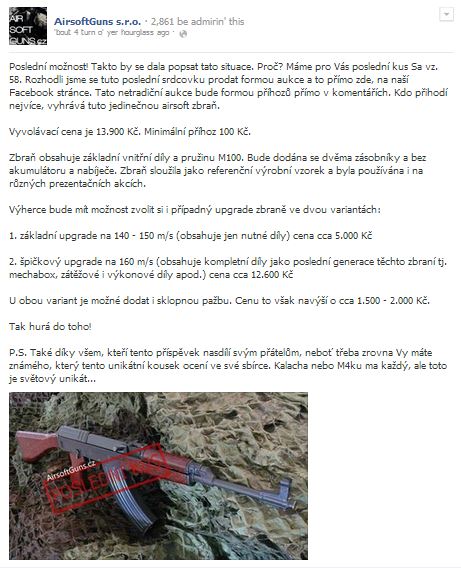 No jo, cena je taková jaká je, jenom že ten kvér je jejich vlastní výroba, sklopka není předělávka z ostré. Ovšem hodně lidí to asi neví, a možná ani vědět nechce. Jsou lidi kteří jsou do toho kvéru naprostí blázni, a koupi si jej. Dneska lidi nemají prachy, a proto jedou do čín, udělají upgrade za pár šupů, a mají silný kvér. Mě osobně je 58 ukradená, ale mít nějakou srdovku co člověk jen tak nesežene, tak si na ní našetřím a pořídim si ji, pro někoho je srdcovka M4, pro někoho SCAR, pro někoho 58. Dívat se na cenu, a veřejně se smát ASGuns že za to chcou nehorázne prachy je divné. ASGuns zas nejsou takoví šmatláci, aby to prodali za co nejvyšší cenu, a pak se vysmáli těm kteří si to koupí. Docela jsem se smál když jsem četl ty komentáře na FB  Třeba kulomet ZB.26 taky stojí přes 20 litrů, a je ještě ktomu v základu, kde to cca má 100 úsťovku, a ten prodejce není divný? Doufám že se tady rozjede pořádná dizkuze, a budou tady padat názory jako u těch předešlých komentářů, které jsou už nějaký pátek staré, jestli jo, tak budu mít z toho vánoce