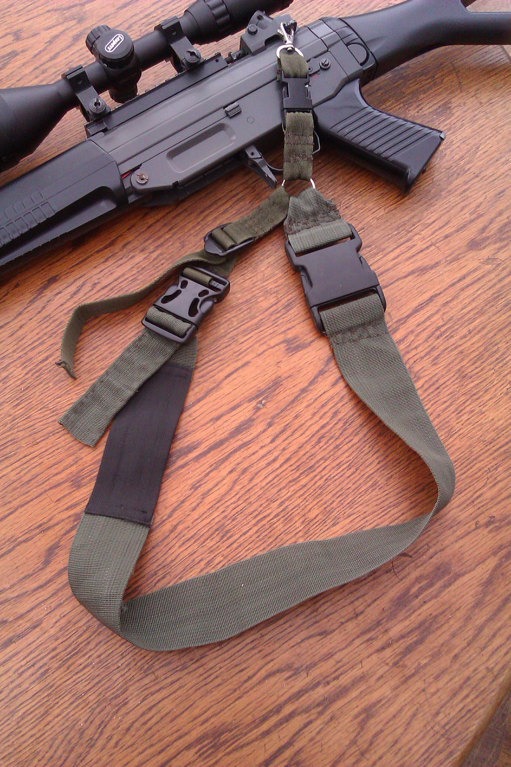 Tak som sa s tým večer pohral kedže som našiel doma pomerne dosť materiálu na výrobu. Funkciu spĺňa dobre a bez problémou môžem pustiť zbraň z rúk s tým že sa nebojím aby sa niečo odtrhlo. Je naňom síce vidno že to bolo ručne šité ale tak pomaličky sa moje šitie zlepšuje  Příloha: