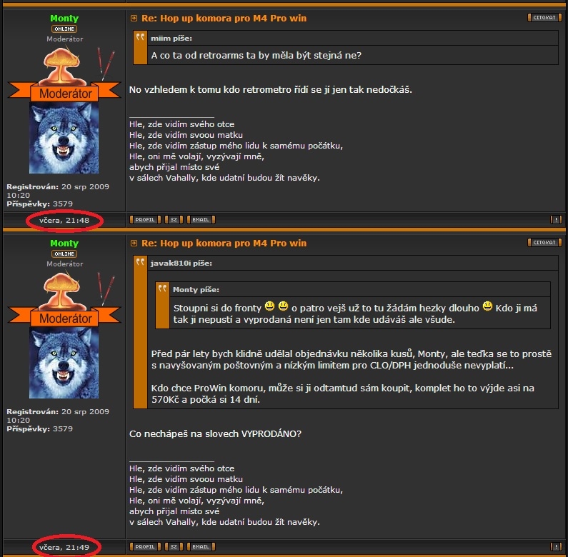 Udělal jsem ti něco, nebo to způsobuje to vedro? Tak za prvé, reagoval jsem na tvůj post ze včerejška (což podle mě není "dost starý"): Monty píše: Stoupni si do fronty  o patro vejš už to tu žádám hezky dlouho  Kdo ji má tak ji nepustí a vyprodaná není jen tam kde udáváš ale všude. Kde slovy "o patro vejš už to tu žádám hezky dlouho" odkazuješ na svůj starší příspěvek: Monty píše: pokud sháníš lidi co by se přidaly tak mám zájem o dva kousky na který jsem ti tehdy neodpověděl. Tak jsem využil situace a ve svém příspěvku vysvětluji, proč hromadná objednávka není možná a zároveň jsem tím uživateli "miim" připoměl, kde se dá ta komora momentálně sehnat. Tvoje reakce? Píšeš tu něco o tom, jestli "nechápu slovo VYPRODÁNO" (ještě caps-lockem), což nedává smysl, jelikož na UNcompany vyprodaná NENÍ. Pak jsou tvé reakce celkem ofenzivní a urážlivé (výrazy jako "meleš", ironie). A také jsi porušil dvě pravidla: 1. double post - dva příspěvky pod sebou oddělené minutou času, místo toho abys si použil edit u prvního z nich. 2. citování posledního příspěvku (není nutné, je jasné, že ten další navazuje na něj). Toto chování je podle mého názoru u moderátora fora nepřípustné. Tímto se velmi omlouvám Jeffovi a Griffovi za off-topic a až si Monty přečte tento příspěvek, klidně ho smažte.