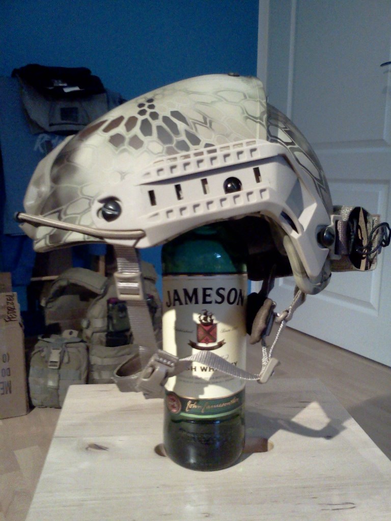 takže zas něco dalšího, tentokrát ne k Africe, ale k moderně. Přilba je kopie Crye Precision Air Frame, kterou vyrábí TMC. Jelikož jsem na netu koukal po recenzích, už dopředu jsem věděl, že celej vnitřek je naprd. Naštěstí se podařilo sehnat, takže jsem dokoupil origo Ops Core H nape pad a Ops Core polštářky. Taky jsem k helmě vzal rovnou VAS montáž na NVG a kapsu na baterky dozadu.