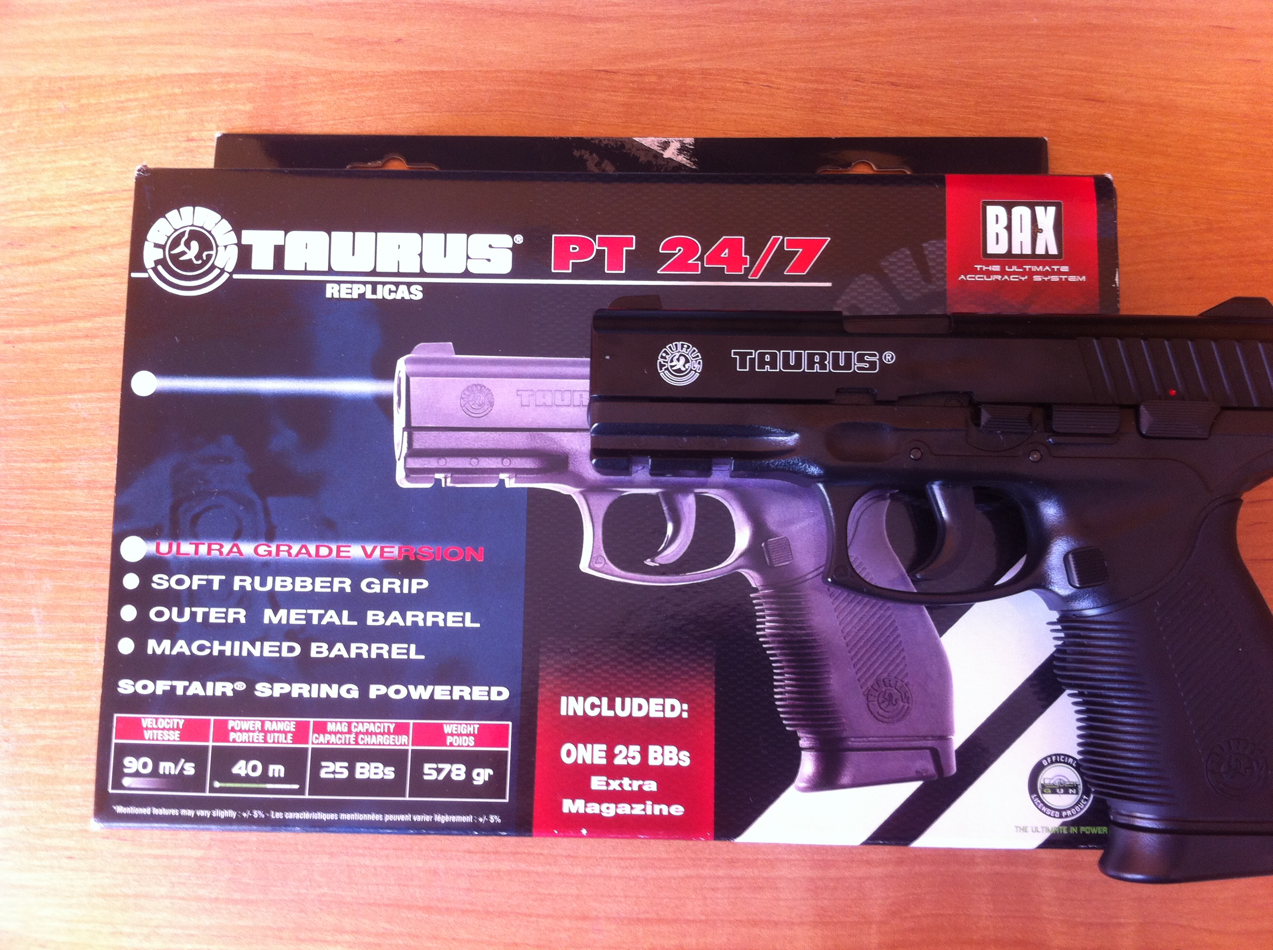 TAURUS:Spracovanie je naozaj na vysokej urovni,telo zbraňe je z veľmi odolného plastu a záver je z jedneho dielu,vnútorne diely sú zväčša z kovu,hlaveň je bronzová a jej priemer je pekných 6.02mm,zásobníky sú vnútri celokovové a sú uložene v pevnom plaste a určite oceníte další zásobik v balení.
