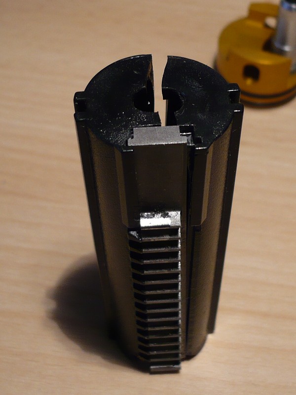 Zbraň jsem koupil novou z BASu. Někdy na konci roku 2007. Mě osobně zas přišlo divný, když jsem viděl bílý... Jinak o nebezpečí prasknutí pístu vím jak jsem již ostatně psal: Tací píše: Celokovový zuby jsem nechtěl, protože jeden píst se všema kovovejma zubama už mi praskl (nebyl to SHS), jelikož toho plastu co to drží pohromadě tam kvůli tomu ozubení moc nezbyde, ale jinej nebyl zrovna skladem.