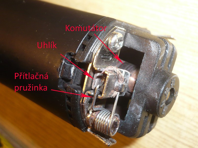 Uhlíky zkontroluj tak, že zkusíš jestli doléhají na komutátor. To znamená jestli nejsou už tak ubroušený, že je ta pružinka nedokáže dotlačit. Dá se to když tak trochu podložit. Zkus za ně taky zatahat jestli v tom pouzdře jezdí a nedrhnou.