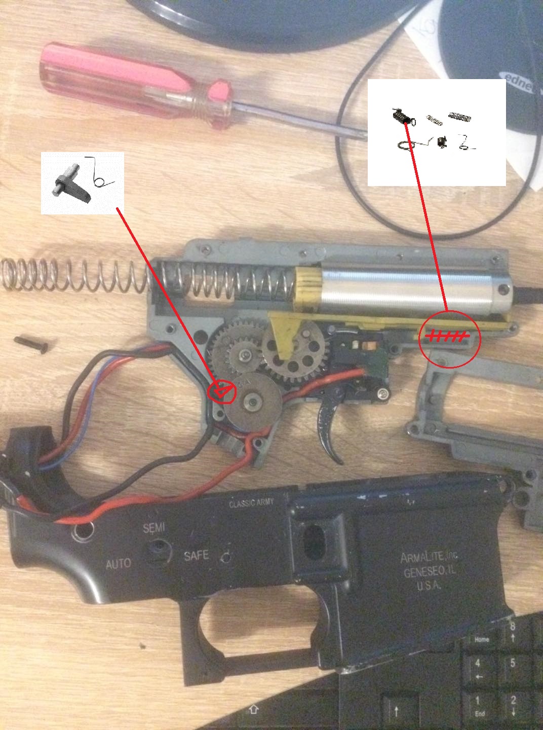 Jelikož jsem baterku dostal až týden po,tak jsem zjistil při připojení, že zbraň nestřílí v první řade jen cvakal motorek a nic se nedělo. Po rozmontování jsem zjistil,že píst byl celou dobu v zadu a mel stlačenou pružinu. ( posílám fotky do přílohy při prvním rozdělání) Podle mě byl píst v háji, tak jsem objednal "Precizní píst s ocelovým hřebenem, SHS" + shs hlavu pístu.