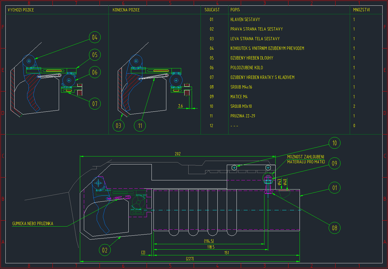 taky jsem chtel ty granaty vyrabet na cnc.ale pak jsem od toho upustil.kdyz jsem to jen tak narychlo v hlave spocital. material z kteryho to budu delat,tesneni,ventilky,program na cnc a cas.tak je to holej nesmysl.i pri vyrobe vice kusu by ses nevesel na cenu treba SHS. a vubec,proc tu chce nekdo vyrabet granatomet?podle me taky nesmysl.jak tu Griffon psal,bude to vypadat hrozne,a stravis na tom hromadu casu a zase prachy za material. ja jsem sehnal starsi od GP s jednim granatem a flaskou plynu za 1200,-. nic mene jsem zjistil,ze takovyhle granatomet na kule,je ulpne na dve veci.jo do baraku dobry. na boj na dalku uplne na prd.takze jsem se dal do prestavby a budu strilet strelnym bezdymim prachem granaty,ktere se pri vystrelu zapali a pak bouchnou. az to bude komlet hotovy,tak vam sem hodim fotky a trebas i video. Jeste ktomu spoustaku co jsi nakreslil.proc tak slozite?jde to preci uplne jednoduse. jestli ma nekdo z tymu m203.tak se podivej na spoustak u neho.usetris starosti a cas.