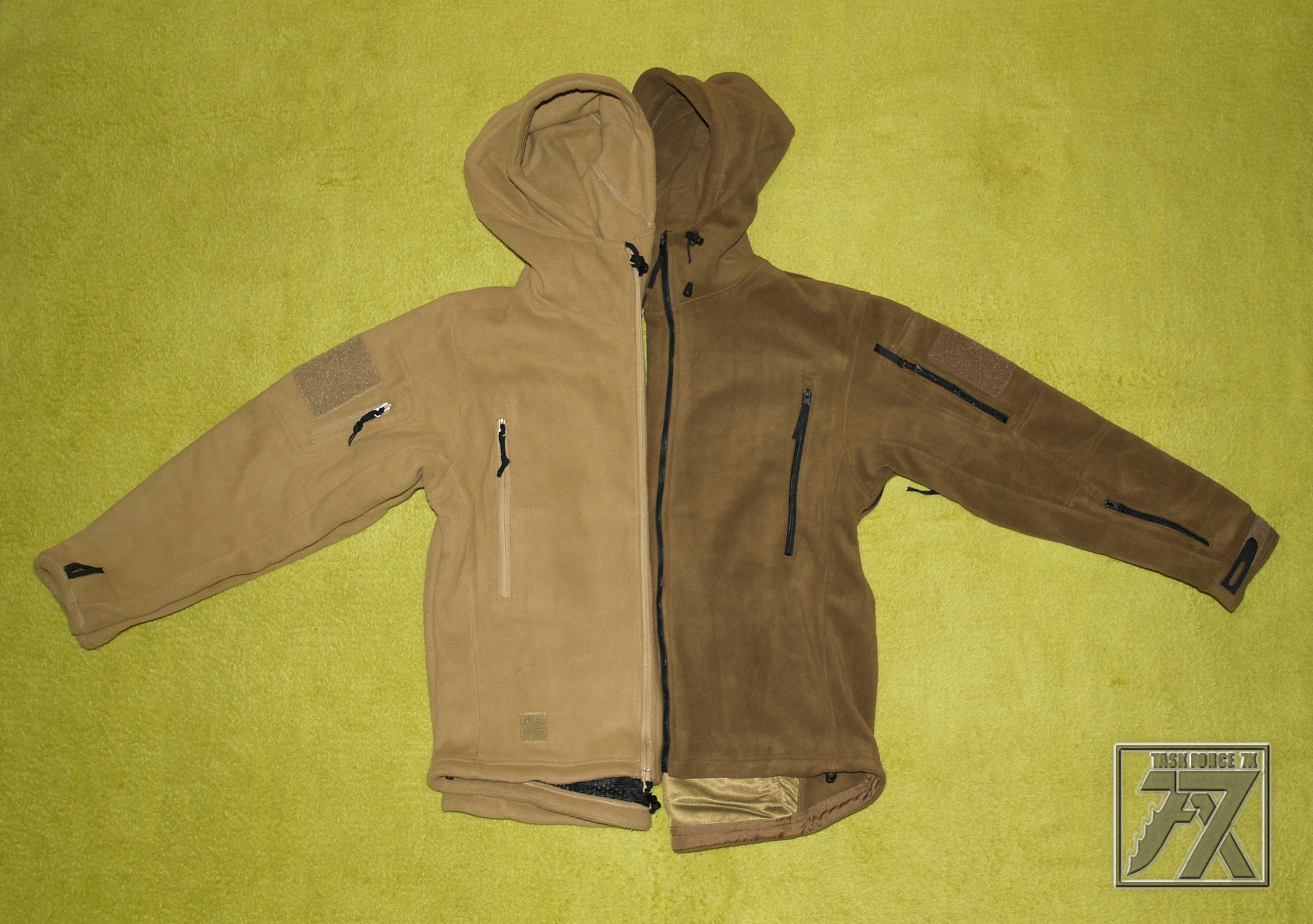 Obě fleece bundy mají stejně velké Velcro panely, avšak 3. kapsa na rukávu je u GFC vlevo (lepší pro praváka) u Helikonu vpravo. Hlavní zip u Helikonu je levostranný u GFC pravostraný.