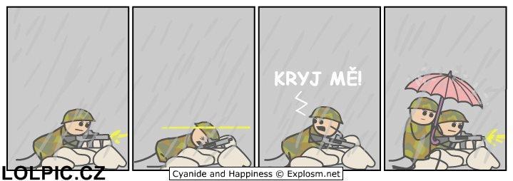 Na vojenském cvičení začalo hustě pršet. Plukovník ríká: "Vojín Koubelík, skočte se podívat do mého auta, zda tam mám plášť!" Po čtvrt hodině se vrací udychaný Koubelík: "Pane plukovníku, plášť ve voze máte!"