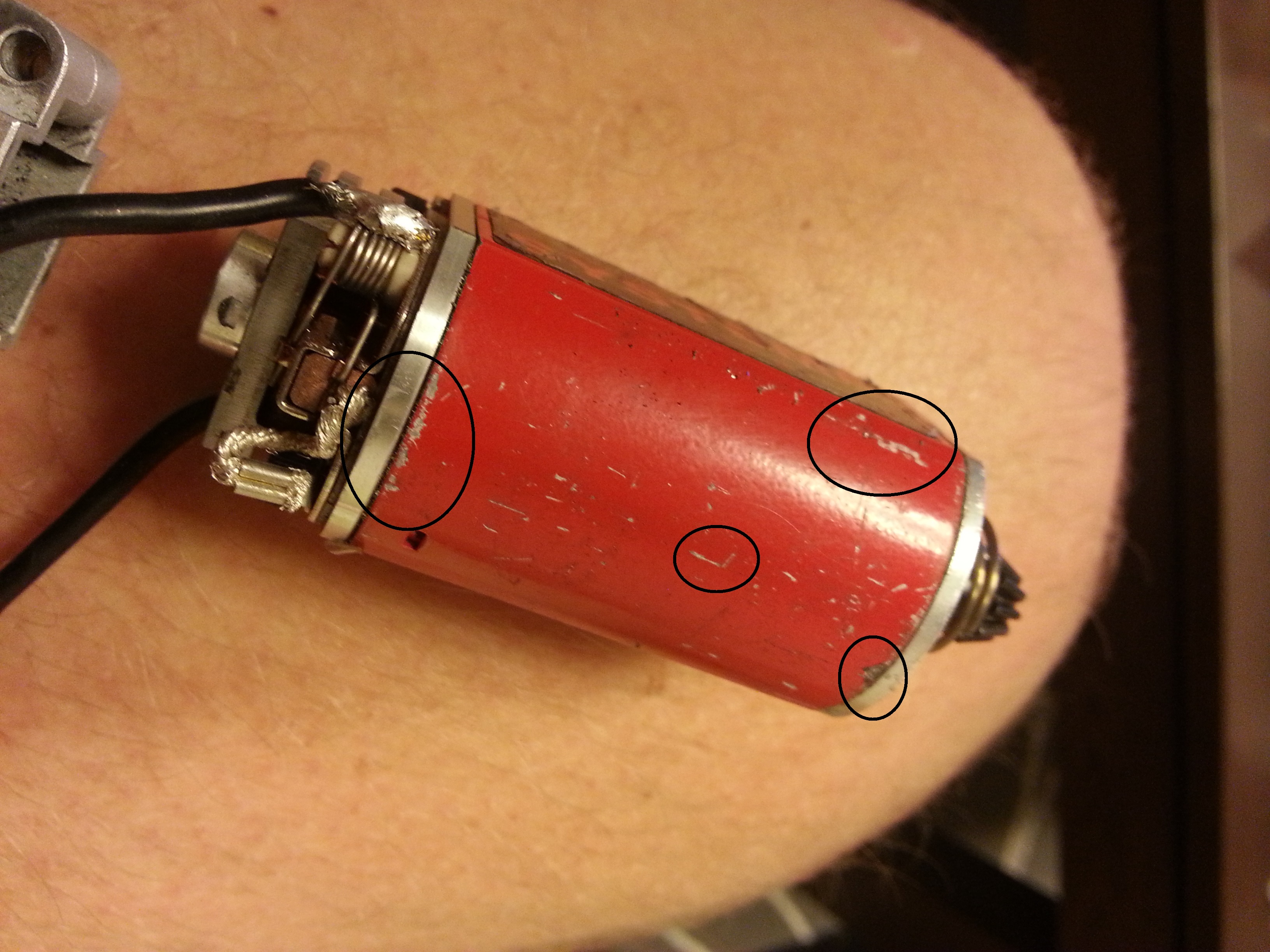 Po uvedeném telefonátu jsem se rozhodl podívat, co se stalo se zbraní a zjistil jsem, že do motoru po zmačknutí spouště jde napětí. S toho vyplývá, že je závada v motoru samotném. Po změření jsem zjistil, že cívka na rotoru je přerušená. Po podrobném ohledání hodinářskou lupou jsem nalezl studený spoj na komutátoru kde je přiletován drát od cívky. Podotýkám, že výše uvedená závada byla již jednou reklamována a dnešním telefonátem s panem XY mi byla tato skutečnost sdělena. Jedná se tedy o závadu stejnou již druhou. Musím konstatovat, že po výrazném zvětšení na fotce bylo zjevně letováno a dle mého laického názoru ne poprvé (foto přiložím). Ostatní upgrade díly nechám na prověření znalcem a prozatím nebudu zbraň rozebírat. Takže CNC mechabox 8mm a jeho náplň a další díly budou i nadále tajemstvím (prozatím).
