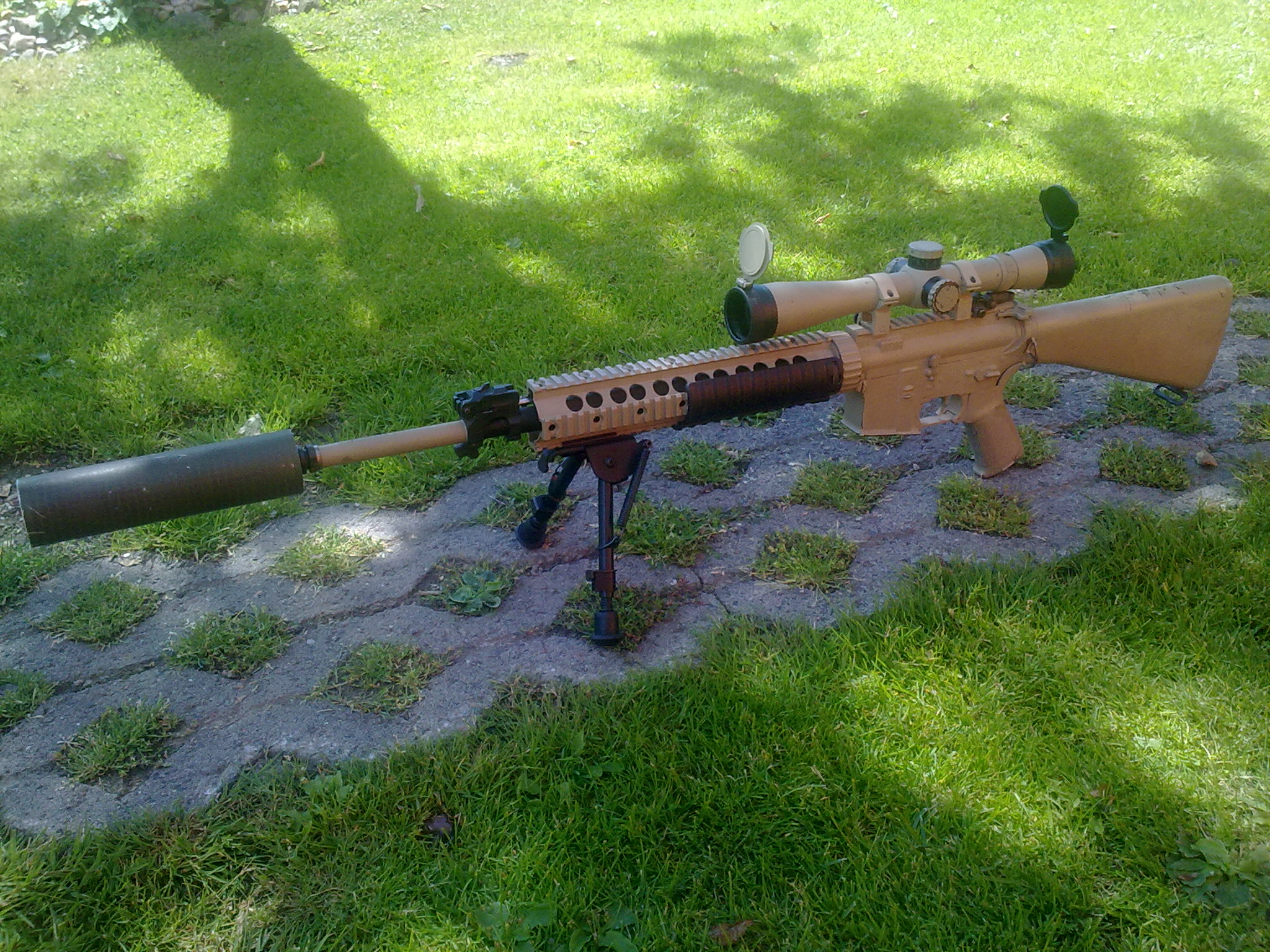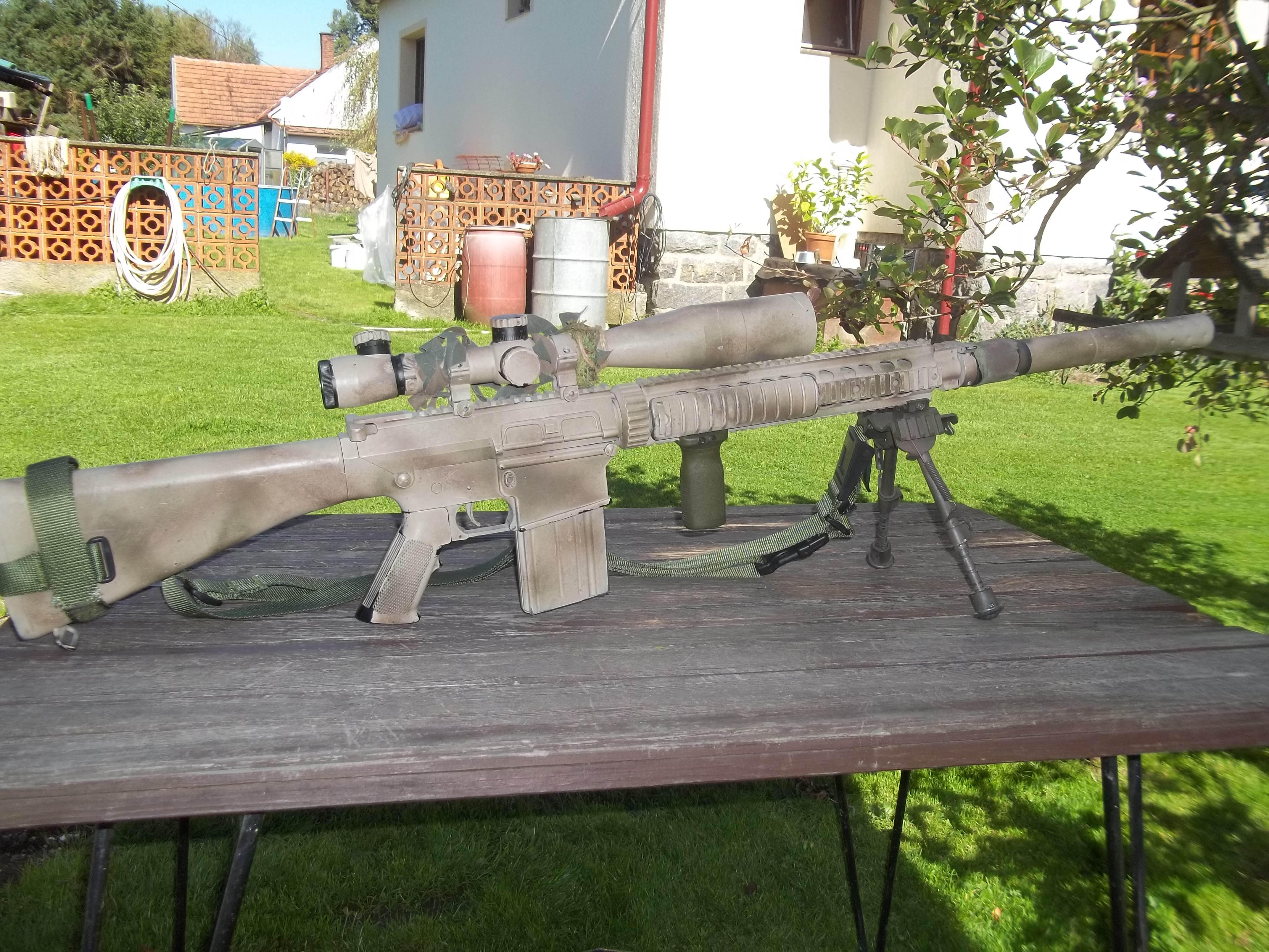 Přiložím svoje dítko. Pořád se mění, něco je momentálně pryč, další věci dodělaný. Uvnitř je M130, zátěžový kola, SHS píst, SHS vysokootáčkový motor s kadencí M134. Komora SHS a 6.02 hlaveň. Svítilna Surefire, která z noci dělá den. Nasvětlovací komora. Kolimátor je teďka ve výměně a rozhoduji si mezi Aimpointem M2 a Eotechem XPS na kryt závěru. BON je určený pro chronické nepřiznávače a jako buřtovač. Popruh je teďka jiný, Magpul MS2. Celé to pohání LiPolka 11.1V schovaná vkusně v AnPequ vč. Ach jo, je to fakt tak těžký? Cenzura by Griffon Proto tam bylo to "disco" , mosfet a silové kabely samozřejmostí. V budoucnu vyměním předpažbí, nejspíše  Jinak max. spokojenost. Přemýšlím o nátěru Krylony, ale je to neskutečné dylema. Beru jakékoliv konstrukční názory. P.S. S Bonem samozřejmě po lese nelítám