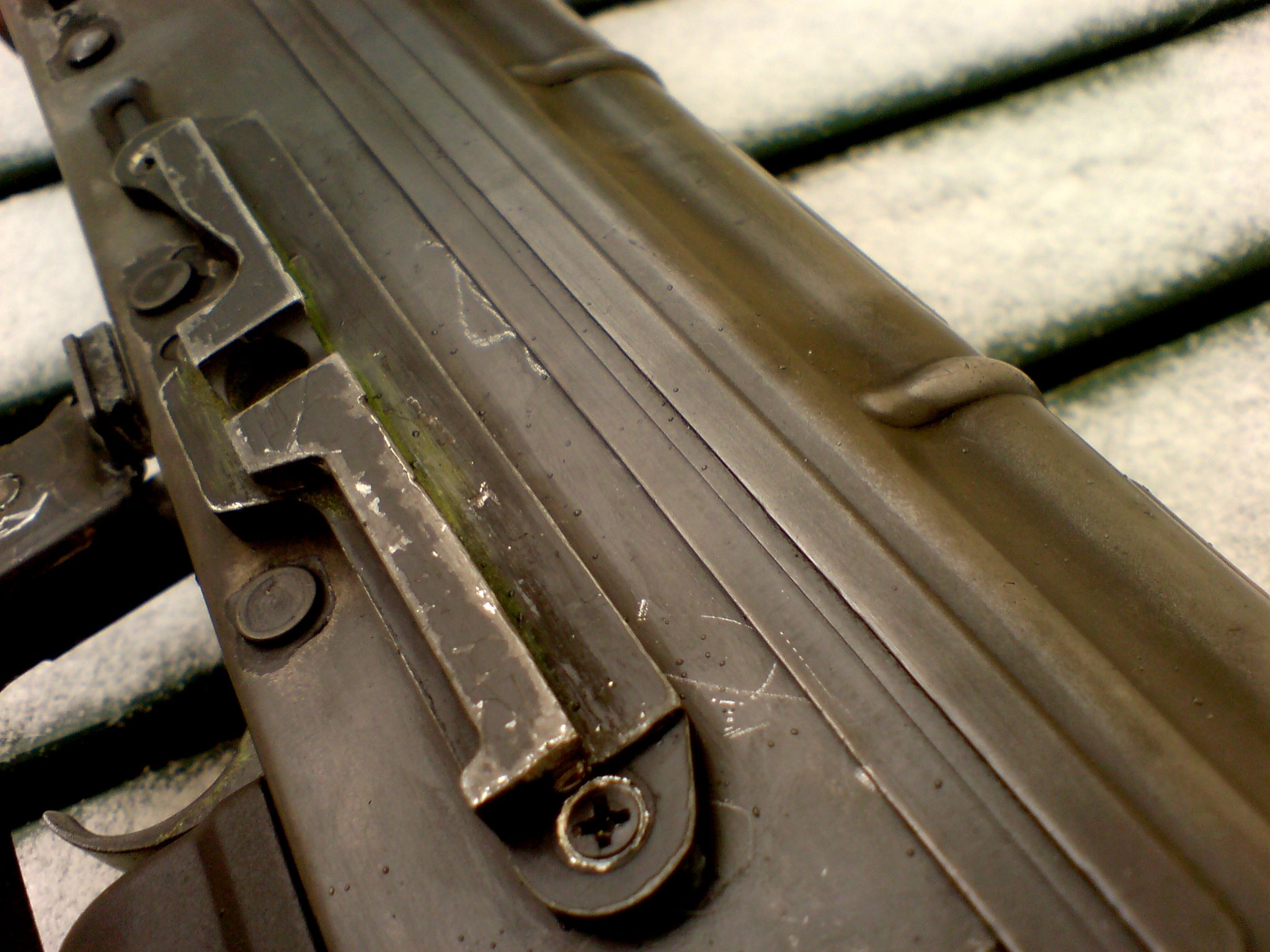 ono to asi jen tak vypadá,ale ve skutečnosti je to hodně matný.Vlastně to teď může být trochu lesklý,je to nakonzervovaný olejem.tohle bylo pro pokus.Chci pořídit ak74 od classic army,nebo časem gbb od WE,protože je celoželezný.nikde žádná slitina magnesia a nevím čeho a na něm provést kompletní brynýrování jak u ostrýho. jinak si hodně zakládám na patině u sovětských zbraní,tak proto tam je nějaká ta barva atd...