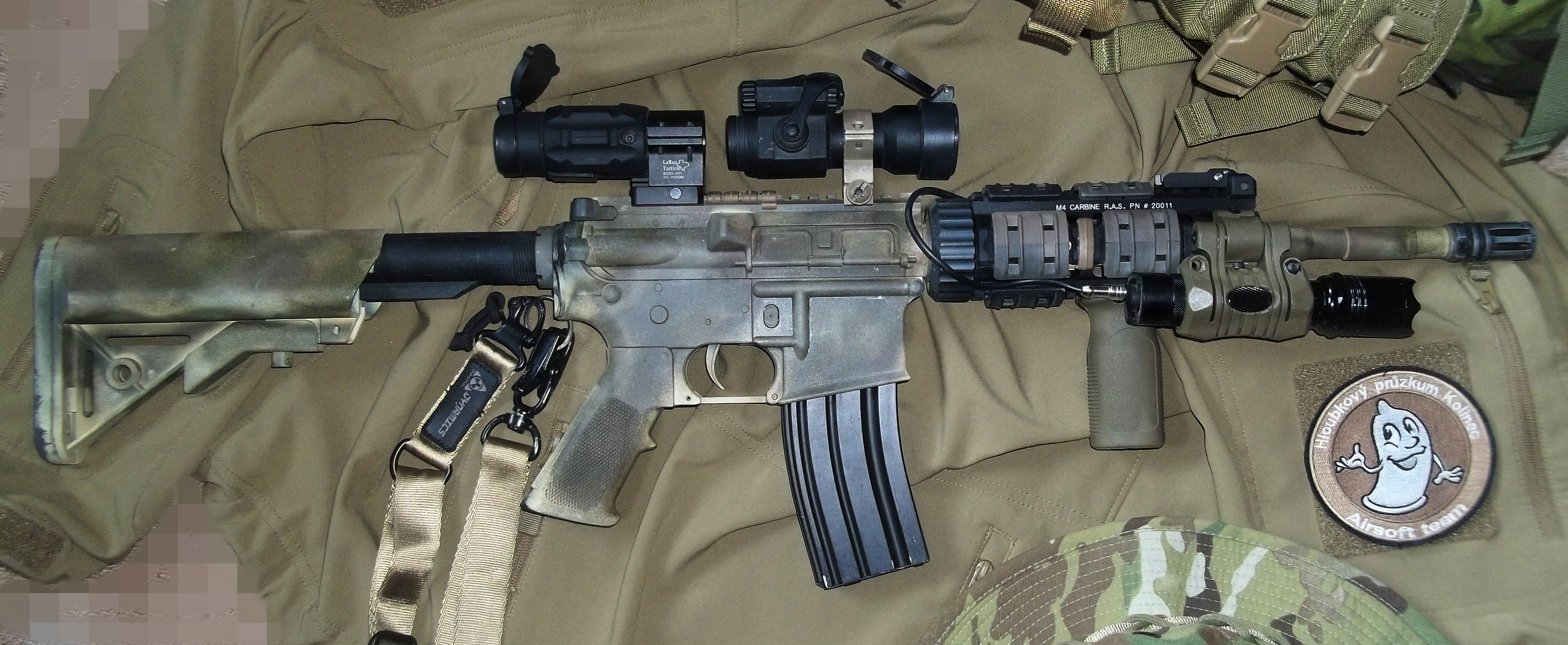 Zde po menších úpravách moje M4. Bývala celá nabarvená, teď jsem odbarvil tělo a pažbu, hlaveň úmyslně zůstala jak je: