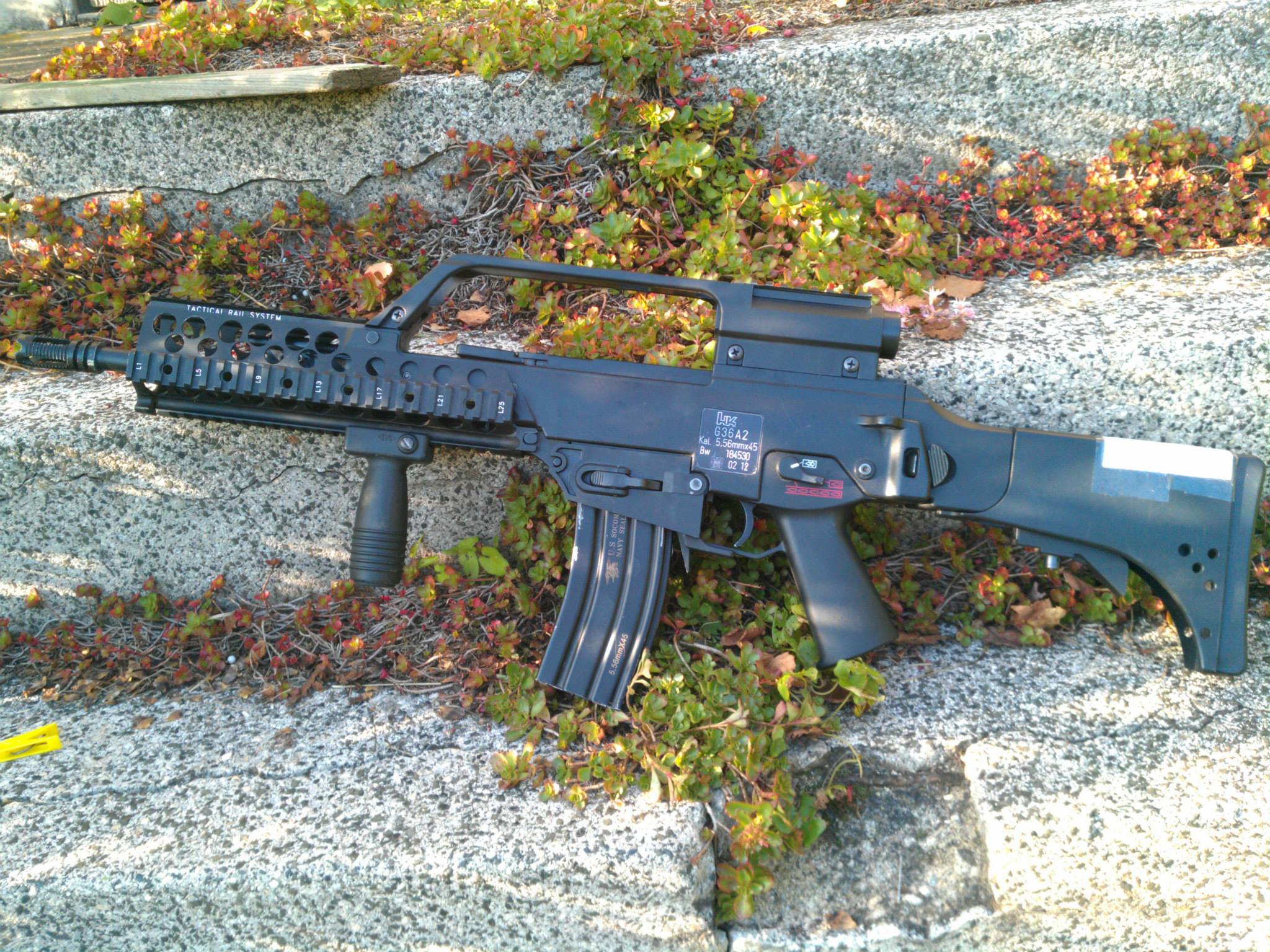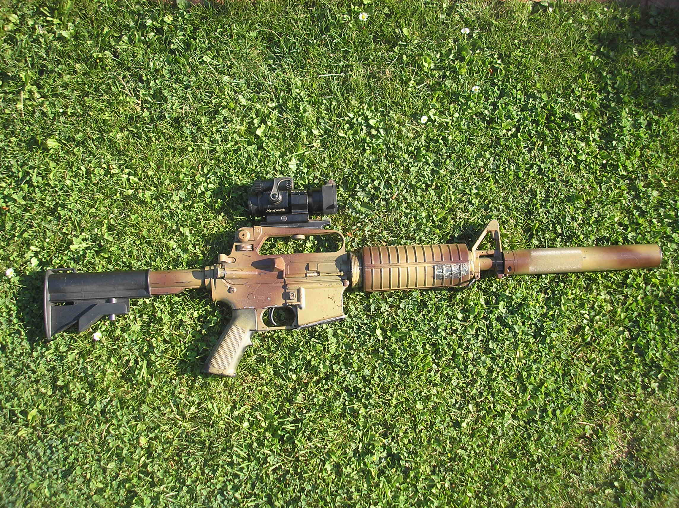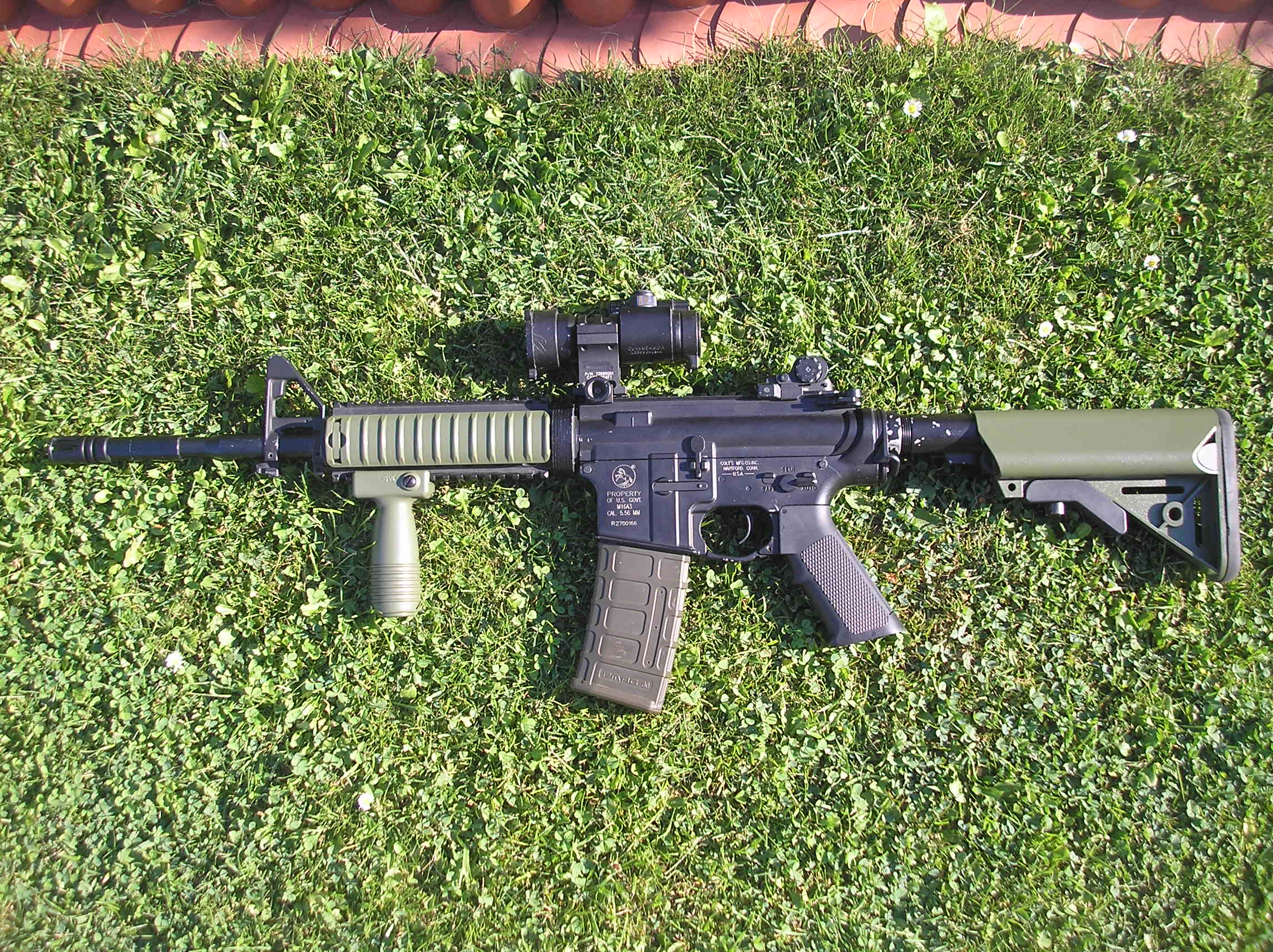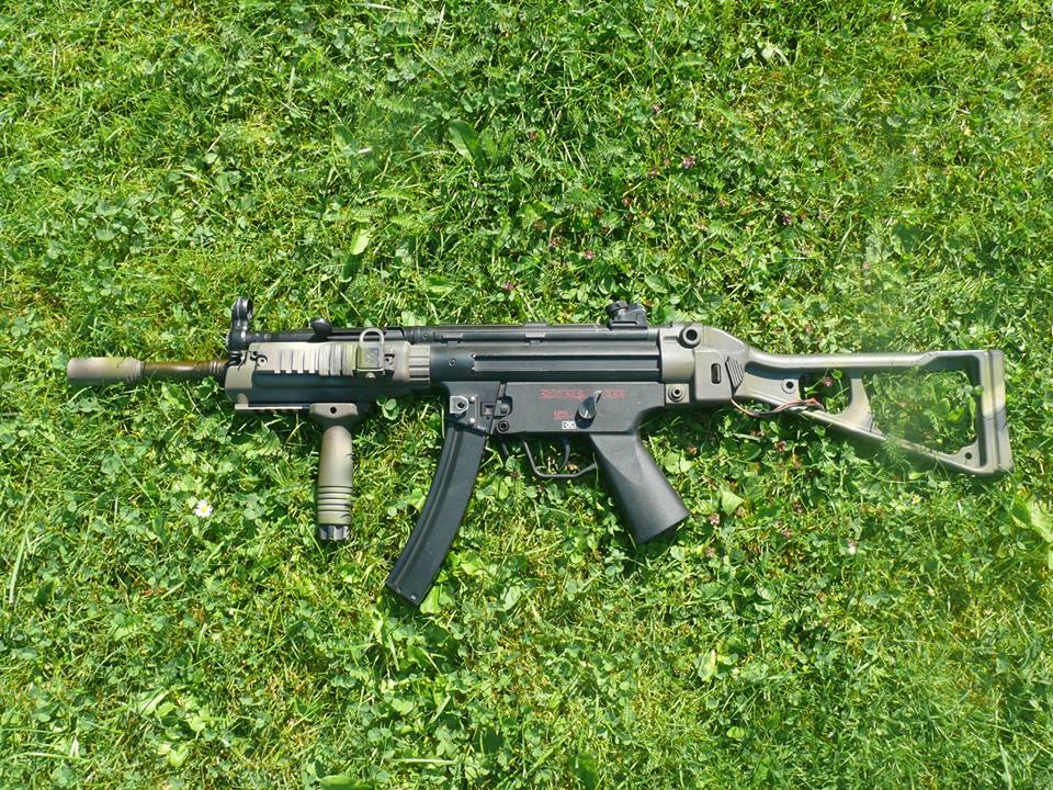 Moje nová kráska, sice měla být pro přítelkyni, ale zabavila mi SUčko a tohle zbylo na mě. Tlumič je takový provizorní, vyrobený doma - v budoucnu bude pískový. Místo téhle šeredné optiky příde ACOG nebo možná Elcan Specter, ale dvojku kvůli kosmetickému detailu se mi v současnosti fakt dávat nechce... Naopak SCAR dvojnožka/grip je fakt úžasně praktická.