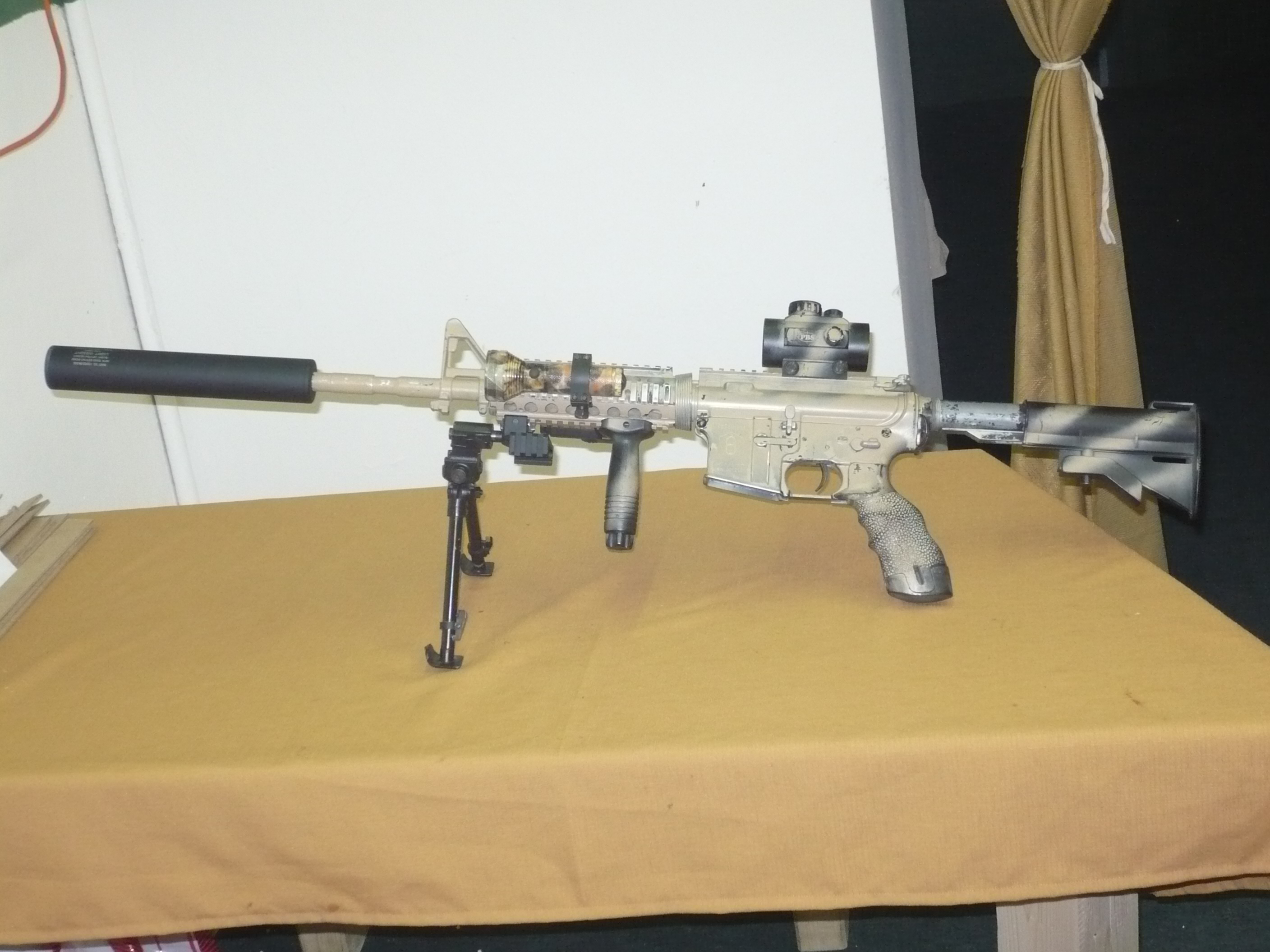 Prodám M4A1 celokov od PJ.Nástřik do Desertu. Vnitřek - kabeláž(1,5mm silikony), 120 brko(nastříleno 6500bb), nová hop guma-guarder, motor od PJ s vyšími otáčkami, vzduch přeťesněnej,nová spoušť od SRC, sniper Grip, Tlumič King Arms s levo i pravotočivým závitem.Nově promazáno vyčištěno, zbraň je spolehlivá.