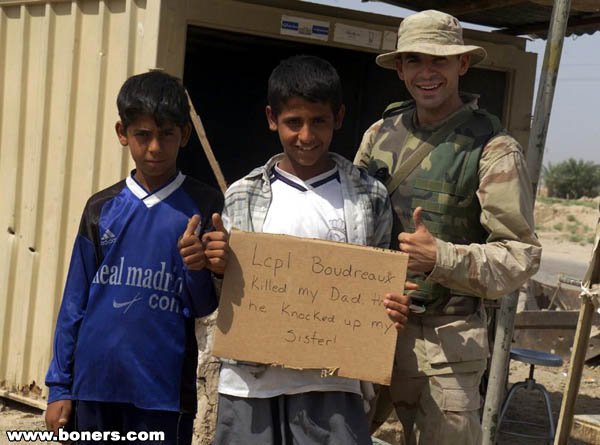 Velká skupina Talibanských vojáků jde po silnici, když vtom se zpoza písečné duny ozve: "Jeden Texaský voják je lepší než deset Talibanských!" Velitel vyšle za dunu rychle deset svých nejlepších vojáků. Ozve se prudká střelba, která po několika minutách utichne a zase se ozve: "Jeden Texaský voják je lepší než sto Talibanských." Rozzlobený velitel vyšle za dunu sto svých dalších nejlepších vojáků a opět propukne ohromná střelba, která po desíti minutách utichne a ozve se: "Jeden Texaský voják je lepší než tisíc Talibanských." Nepříčetný velitel shromáždí tisíc vojáků a vyšle je za dunu. Rozeřvou se děla, granáty a kulomety, které po půl hodině ztichnou. Po chvilce se zpoza duny připlazí smrtelně raněný Talibanec a ještě před smrtí varuje velitele: "Už tam nikoho neposílej. Je to léčka. Jsou tam dva." Sice to není military ale taky dobrý  : http://vyzennudu.odhaleno.cz/detail/19394/