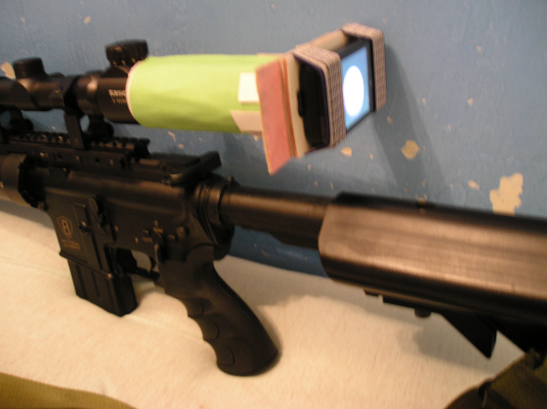 A ještě jsem si vzpomněl na jedno řešení, které jsem vymyslel, když jsem si pohrával před časem s myšlenkou fotit a natáčet přímo přes optiku a zároveň mířit přes displej. Udělal jsem si takový nástavec z tvrdého papíru s elastickými popruhy pro své PPC(HTC Touch Pro). Je to fakt prasárna, nechtělo se mi s tím tehdy dělat, jen kvůli tomu že si s tím nafotím pár fotek a udělám pár videí. Každopádně se to dá udělat mnohem lépe a z podstatně lepšího materiálu. Pokud by s tím chtěl někdo i hrát, tak by se musela optika posunout pořádně dopředu, aby bylo pěkně vidět na displej. V praxi jsem to ale moc nevyužil, protože HTC Touch Pro fotí a natáčí napytel, chtělo by to k tomuto účelu něco pořádného.