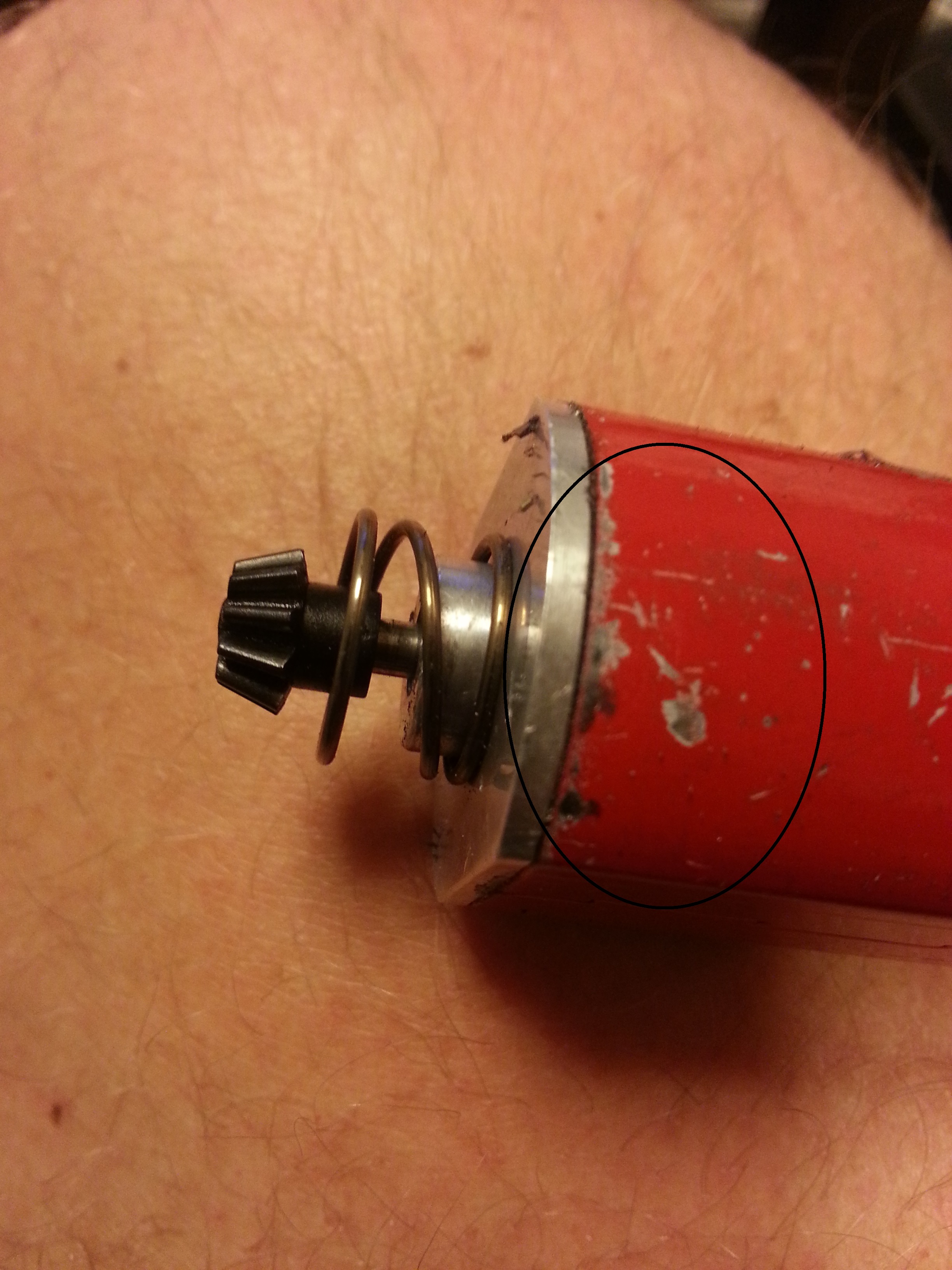 Po uvedeném telefonátu jsem se rozhodl podívat, co se stalo se zbraní a zjistil jsem, že do motoru po zmačknutí spouště jde napětí. S toho vyplývá, že je závada v motoru samotném. Po změření jsem zjistil, že cívka na rotoru je přerušená. Po podrobném ohledání hodinářskou lupou jsem nalezl studený spoj na komutátoru kde je přiletován drát od cívky. Podotýkám, že výše uvedená závada byla již jednou reklamována a dnešním telefonátem s panem XY mi byla tato skutečnost sdělena. Jedná se tedy o závadu stejnou již druhou. Musím konstatovat, že po výrazném zvětšení na fotce bylo zjevně letováno a dle mého laického názoru ne poprvé (foto přiložím). Ostatní upgrade díly nechám na prověření znalcem a prozatím nebudu zbraň rozebírat. Takže CNC mechabox 8mm a jeho náplň a další díly budou i nadále tajemstvím (prozatím).