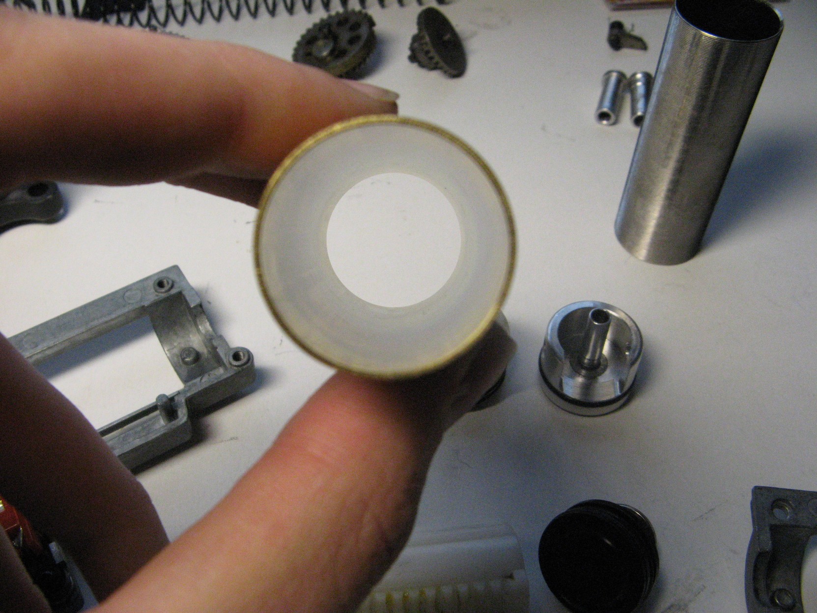 Nazdar! Tak jsem se rozhodl upradovat svoji M16A4 od GP na pružinu M120. Hlavní část upgradu tvořilo toto: http://www.guruupgrade.com/sety-valce-n ... nikl-profi . Dále jsem přidal mosfet a hop-up gumičku a pružinu od guarder. Když mi tento set přišel, měl jsem rozporuplné pocity. Píst měl 14 kovových zubů (na stránce psáno 16) dva evidentně zbroušené na konci. (přisuzuji to chybě stránek, jelikož na obrázcích měl taky 14 zubů). Válec my přišel jakýsi hrubý (myslím vnitřní povrch ne vroubkování svrchu na odvádění tepla) a lehce špinavý (nešlo vyčistit suchým papírovým kapesníčkem) což mně moc nepotěšilo. A tryska byla z vrchu čímsi zašpiněná. Dále dorazová guma na hlavě válce měla uprostřed jakýsi výron. Celkově jsem čekal lepší zpracování, jediné co má u mně 10 bodů je hlava pístu která je zpracovaná opravdu luxusně. Dnes jsem zbraň otevřel a koukají na mně další překvapení: píst GP má 15 zubů (tři kovové). Válec (plný, bez díry) s hladším vnitřním povrchem než ten od guru. Takže se ptám: je ten válec v pořádku? Čím mám ten válec čistit? Nebude menší počet zubů na pístu dělat problémy? (asi ne díval jsem se na obrázky jiných pístu a počty jsou buď 15, nebo 14 zubů jen nemám praktické zkušenosti). Je ta tryska v pořádku? A copak GP má v základu NBU vzduchárnu nebo je to jen zvláštní válec bez díry?. Foto: