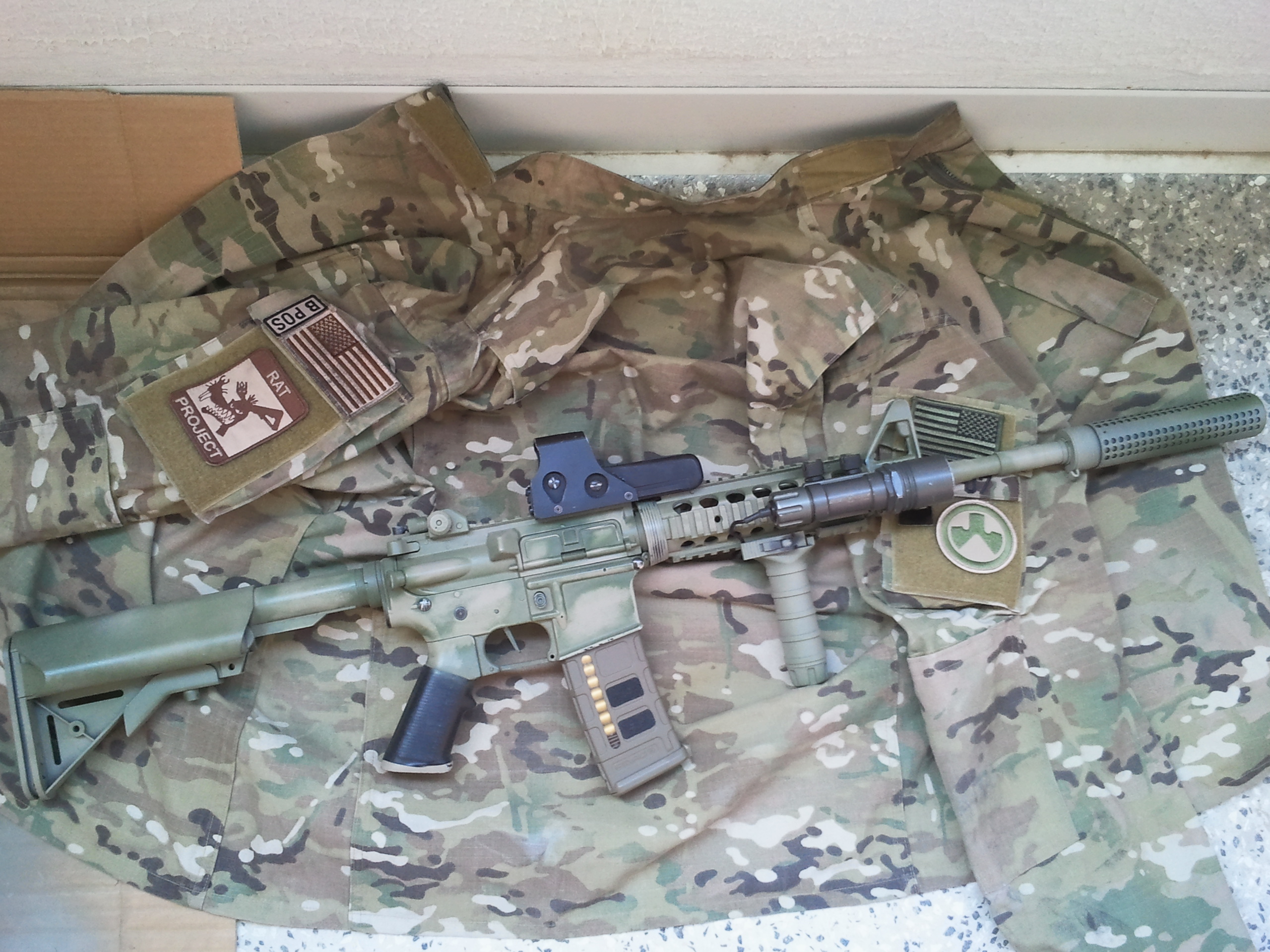 LCpl Twombly píše: Ono původní plán byl přes síťku tam cáknout pár "plástvovejch" fleků hnědý barvy ale jelikož ta zelená je opravdu sakra zelená, tak se bojim jestli by to teď na tom ve výsledku nebylo jak pěst na oko. Moc to řešíš, vegetace+páska(důvod?)+síťka  ... to si piš, že teď bude cokoliv jako pěst na oko  navíc je to strašně výrazný a od většiny prostředí to imho nesedne... samozřejmě až se to zajede, tak je to asi jedno, ale takhle (navíc takhle vyfocený) je to divný a nesedí mi to. Doporučuju se s tím nesrat  Vem barvy, nějak to nastříkej, kriticky všechny "pěsti" (co z toho nějak extra trčej) přestříkni, když to přeženeš, tak to přestříkni zpátky a je to... nejlépe všechno přes vegetaci, dává to nejlepší výsledky (ale znovu, nesrat se s tím, někde na netu je českej návod s kapradím na ostrý M700 a je to fakt hezký, hlavně ať jde vidět každej lísteček, moc super  ) příklad třeba moje tohle: https://www.facebook.com/photo.php?fbid ... =3&theaterJo a taky jde strašně poznat, co byl základ a co je nastříknutý přes šablonu, protože okraj jsou jen khaki/zelená, nebo khaki do zelený, ale ne naopak, osobně to rád prolínám oboustranně.