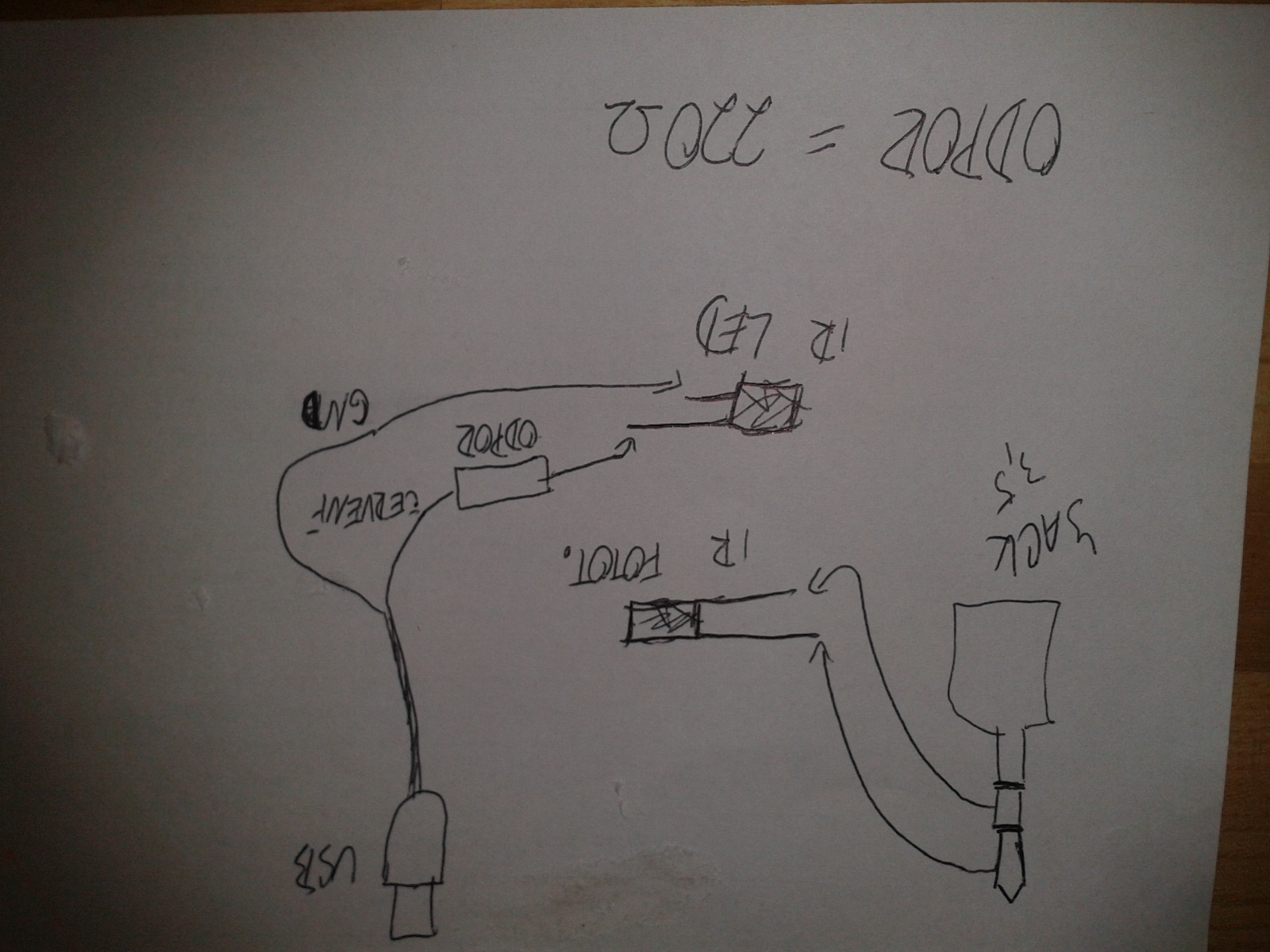 Cerveny kabel od USB - rezisotor [mam keramicky 220R] - IR led dioda [delsi konec]