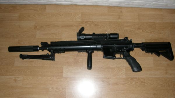 Bráchova puška. Je blázen do velkorážnejch pušek. Sniper rifle MK 15 mod 0. (McMillan TAC-50) Vnitřnosti z APS-2, vevnitř 380% set. Pažbení plech 2 mm. Váha cca 6 kg.
