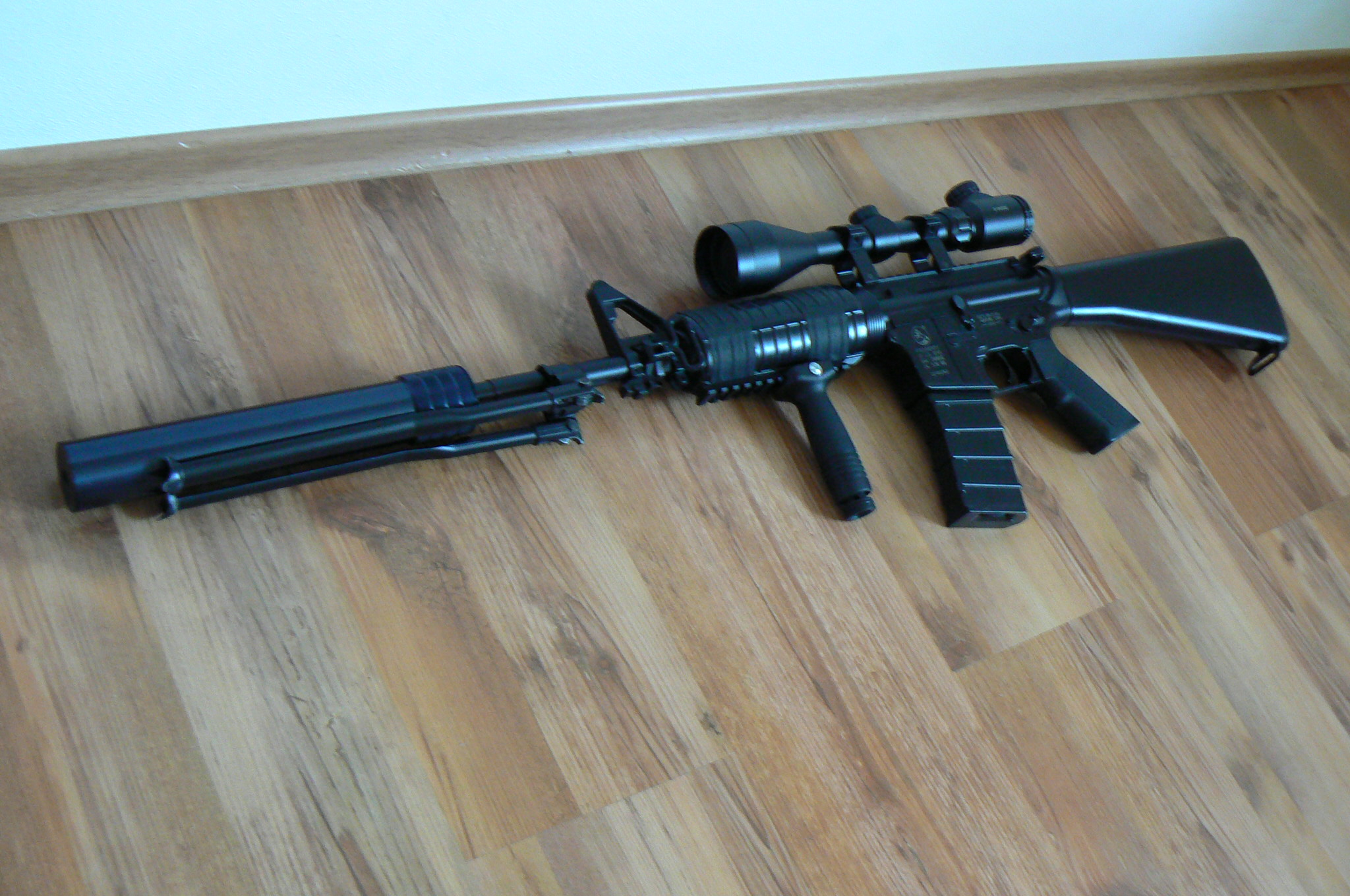 tady jsou moje guny, je tam M4 CQB od PJ, L96 (MB-01) od wellu s optikou M3, USP od DE sry za kvalitu fotek je to focený mobilem