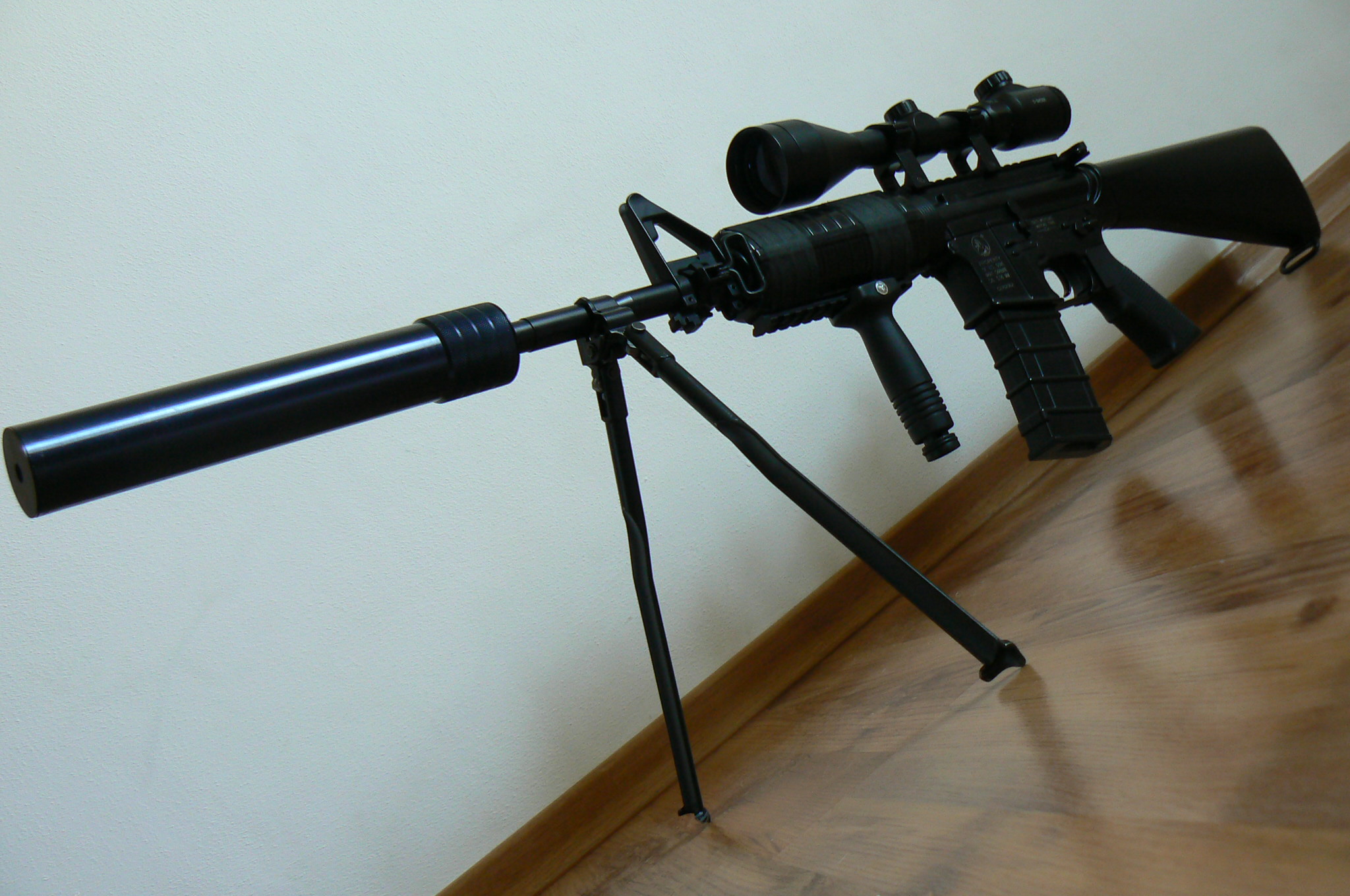 Moje momentální primárka je jaksi sprzněná JG M733. Zásobníky: 300BB, 30BB, 190BB, 3x 130BB Příslušenství: XCell 8.4/1500, SANYO 8.4/1700, 2 bodovej popruh Vnitřek  Komplet vyměněnej za vnitřek z JG M4A1 kromě pístu a hlavy válce (byly zde lepší), pružina M110, SRC motor, systema guma,... Plánovaný upgrade: Kably s mosfetem, Hlava pístu POM