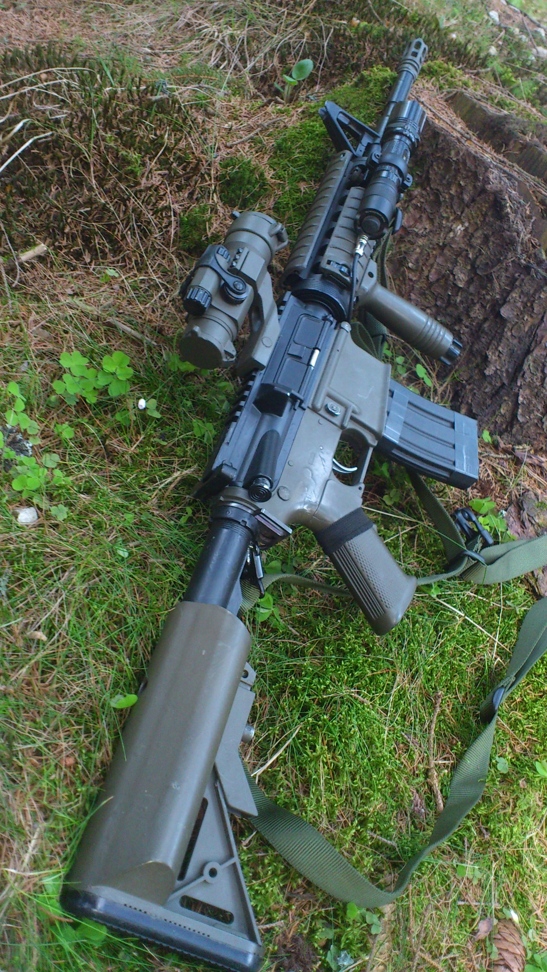 Jenom opravdu malá aktualizace. Tráva je konečně pořádně zelená, počasí super, tak jsem udělal fotku. Změnil jsem akorát pažbičku za MOE a magpulovej kryt spouště. Teď jsem zhruba na 80%. Ještě dát CQB hlaveň, jako takovou nástavbu dát nějaký pěkný tlumič. A pokud seženu předpažbí, které chci, tak z toho udělám M6A2 - to bych byl teď tak na 70%.