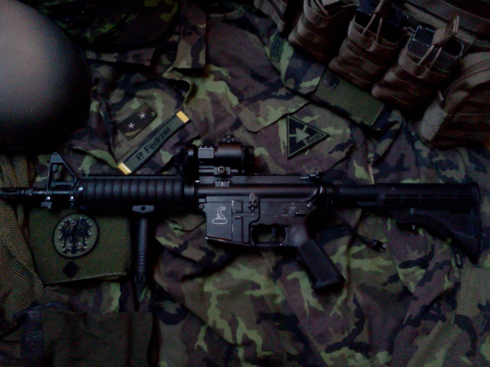 Moje M4CQB-R od DBOYS, dodělaná částečná Bushmaster ražba na šachtě, předělaná pažba. Ke kolimu by to chtělo vysokou montáž. Inspirováno fotku 601. (omlouvám se za kvalitu fotky)