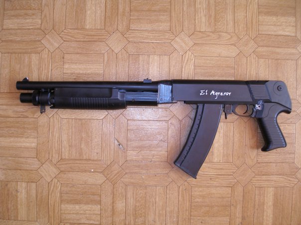 Ještě přikládám jednu historickou  moje vlastní tvorba - prakticky vnitřnosti z AK od Cymy implantované do těla manuální brokovnice - prostě taková tvorba "for FUN"  ale střílelo to parádně  Nazval jsem ji "El Agresor" Příloha: