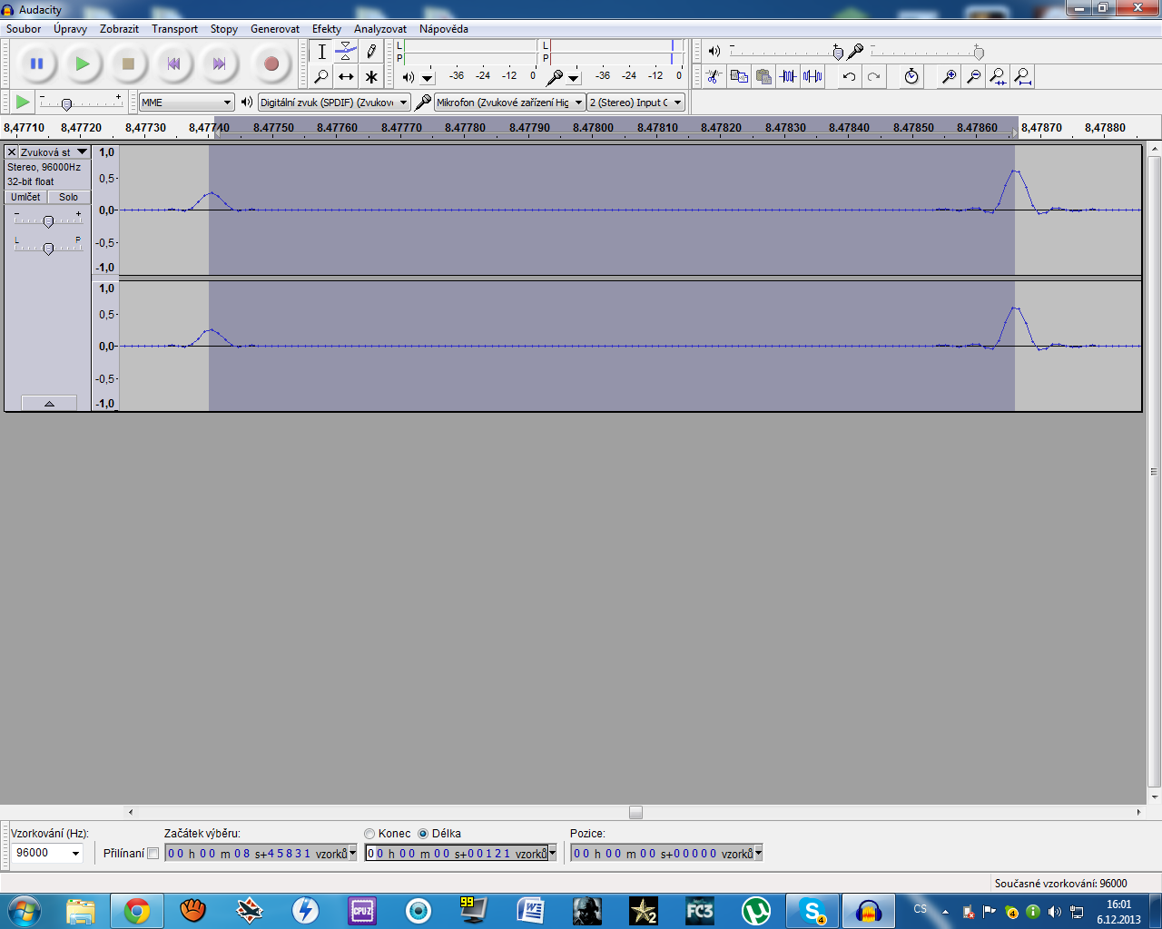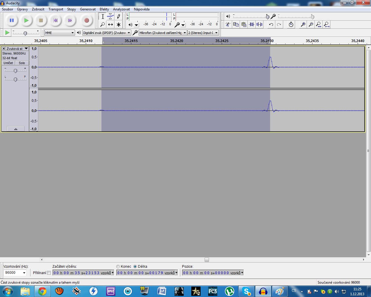 delka je 121 vzorku, snimkovaci frekvence je 96000 snimku za sekundu takze 121/96000 je 0,00127s, delka je 137mm takze rychlost je 107874mm/s neboli 107,9m/s