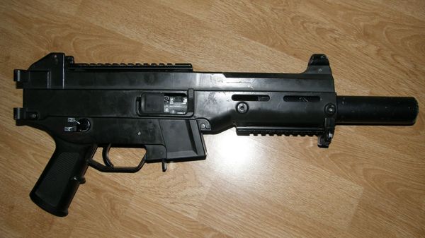 UMP double eagle zlomená pažba vyměněna za kus duralu ohlýho z vršku těla na rukojeť, tlumič (deep fire) zasunutý až do předpažbí Příloha: