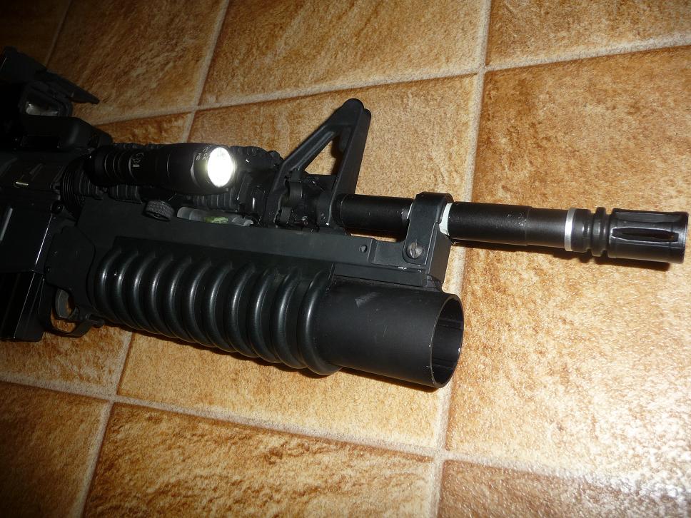 Vnějšek: 1 Hlaveň pro M4A1 přední část element 2 očko pro 1b popruh element 3 homade tlumič 4 RISka na spodu předpažbí 5 ručka na RIS