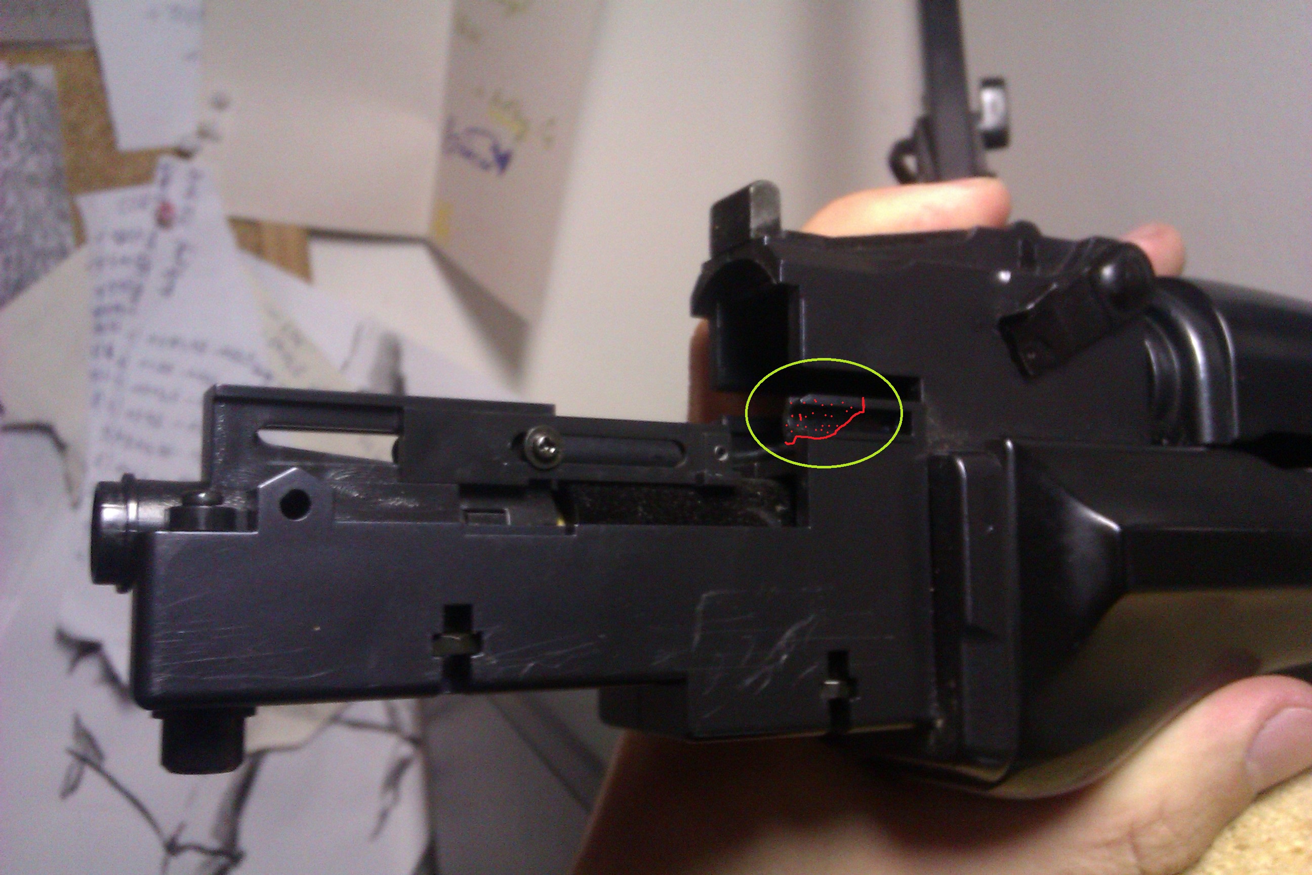 Hlásím, že mám konečně AK47 doma  Nakonec jsem pořídil uplně jinde za 2600,-... Dostal jsem dva zásobáky a vnitřek zbraně je prakticky novej  Můžu mluvit o štěstí Jediný problém, který mě lehce trápí, je nepatrná prasklinka na středovém díle. Přikládám fotku ("trajektorie" praskliny červeně, fleky ozačují "uvolněnou" část). Je to namáhaný díl? Stačilo by tu část pouze přilepit kvalitním lepidlem?