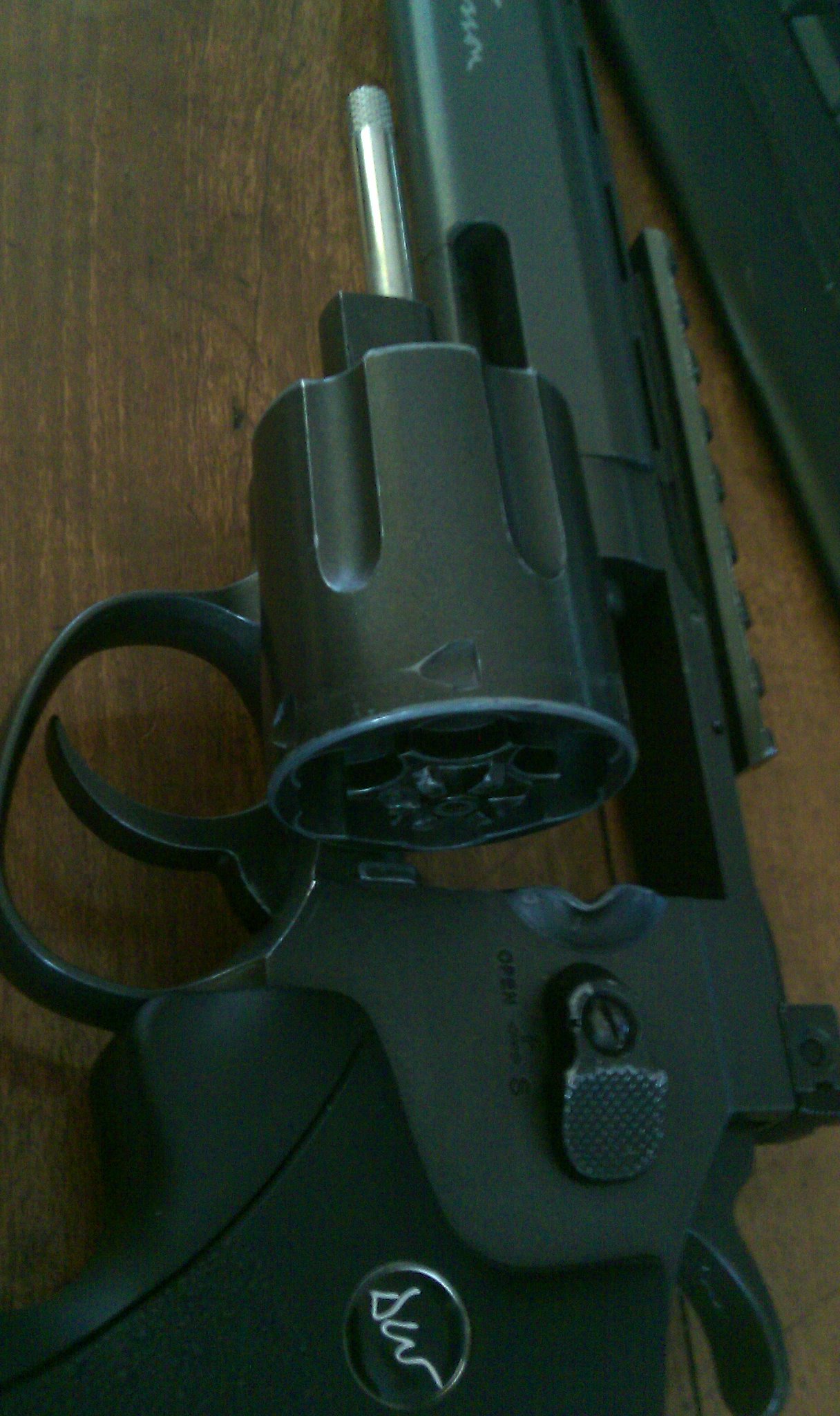 čus páni. mám jaksi velkej problém s tímto wessonem a to v bubínku. Foto mluví tisíci slovy. Jak je vidět, chybí jakási tyčinka která zajišťuje bubínek tam kde má být. Dále je na fotkách zřetelný (můj dojem) že ta stříbrná "tyč" asi není původní.