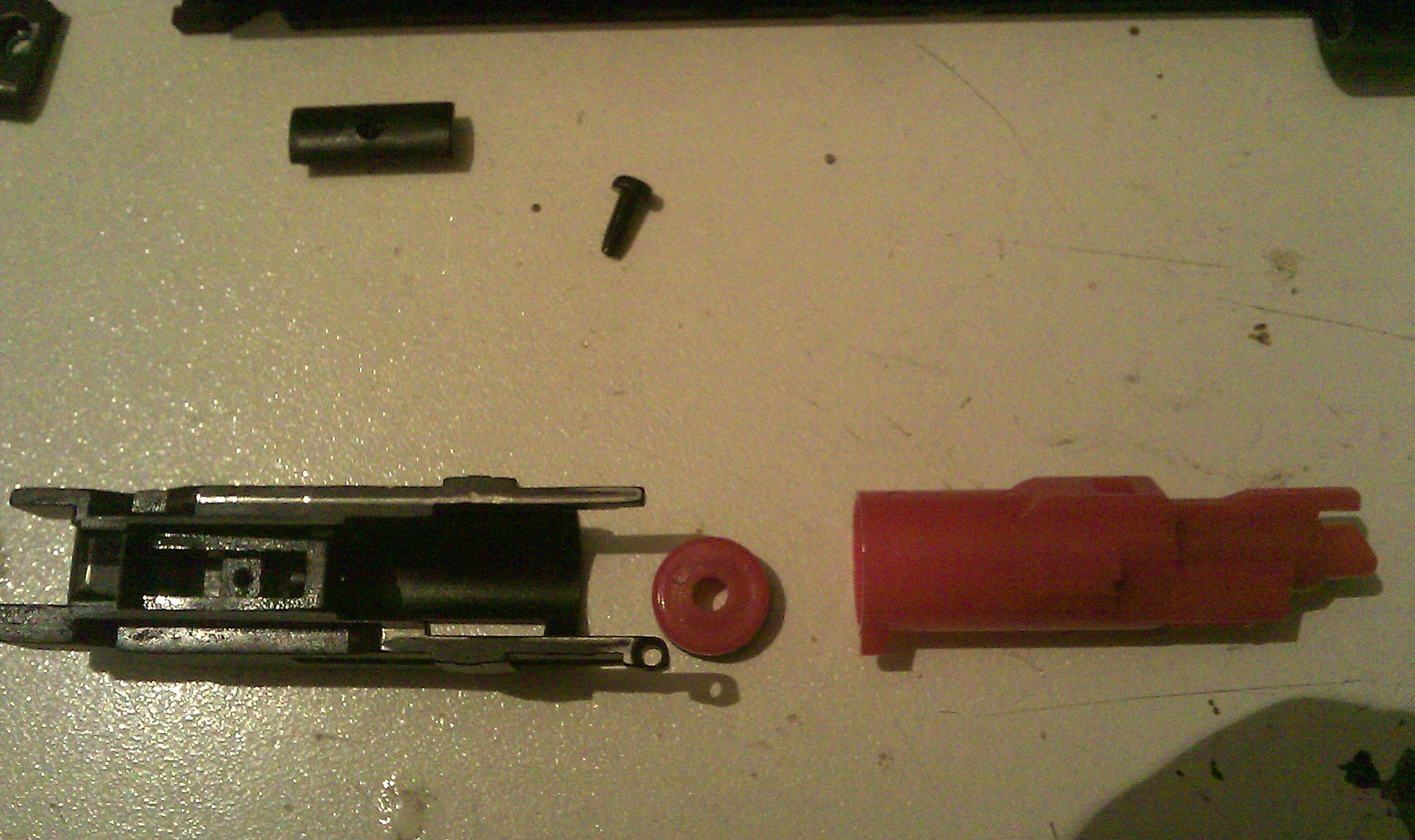 Takže pokud vyjmutý blowbec s tryskou položíš na stůl ližinami dolů ve směru střelby před sebe, tak z boku na trysce jsou z levé a zpravé strany výstupky, ty při pohybu blowbecku vzad můžou zachytávat o výstupky na blowbecku a tím pádem se tryska odpojí brzo. Takže dle potřeby výstupky na trysce snížit. Pracuj pomalu, raději méně, než na poprve více. Nebo můžeš zkosit hrany na blowbecku, kde se setkává výstupek trysky s výstupkem blowbecku.