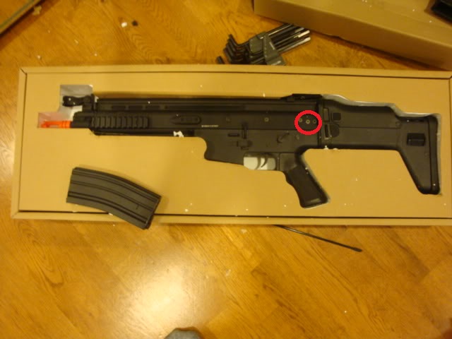 To je fotka tvého Scaru? Dle fotky tam vypadá vše "normálně". Šrouby pro sundání pažby a zadního dílu těla jsou tam 3 (na každé straně - ten nejblíž pažby a jeden nahoře)...ostaní "šrouby jsou jen "dekorace".