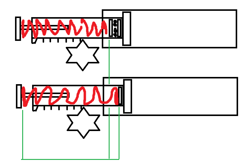 Mám podobný problém, měnil jsem píst a hlavu pístu. Hlava pístu má ložiskové podložky na pružinu. (Je potřeba je mít i u trnu?) Jak jsem psal, mám podobný problém, párkrát vystřelí a pak se zakousne. U mě je to způsobeno nejspíš tím, že píst, když se natahuje, tak ta pružina M110 se stlačí, ale pak mi přijde, že už motor nemá takovou sílu, aby ji stlačil uplně aby píst povolil a vystřelil... no udělal jsem obrázek, tak snad se to z něj pochopí. Možná se to tady už řešilo, nebo je to obecně známej fakt, ale mě asi obešel, každej se nějak učíme... Našel jsem si pojem short shooting - krácení zubů, což mě přišlo trochu i logický.