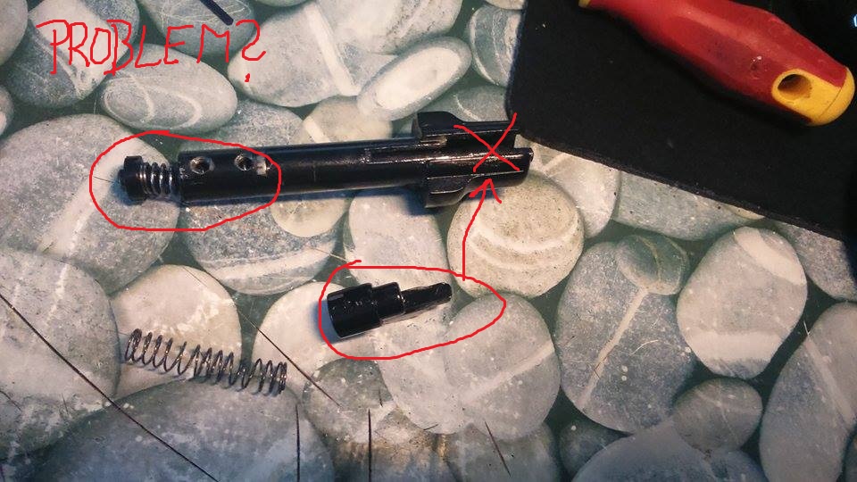 Nejak mi neni jasná tá 3tia foto?Ako ti to drží natiahnuté bez výstražníku? A na poslednej už to máś rozobrané.Pri rozoberaní záveru sa mi nikdy nestalo že by záver ostal"natiahnutý" Ako si teda vlastne vybral výstražník? Hentak ti to zo zbrane proste nevyleze, nezaseklo sa ti to tam tak dodatočne?..z tvojho popisu fakt nechápem na aké možné problémy narážaš. Inak pružina o.k má mať okolo tých 70 mm. Zásobník máš zle, pružinka musí byť zaistená závlačkou. Viď foto