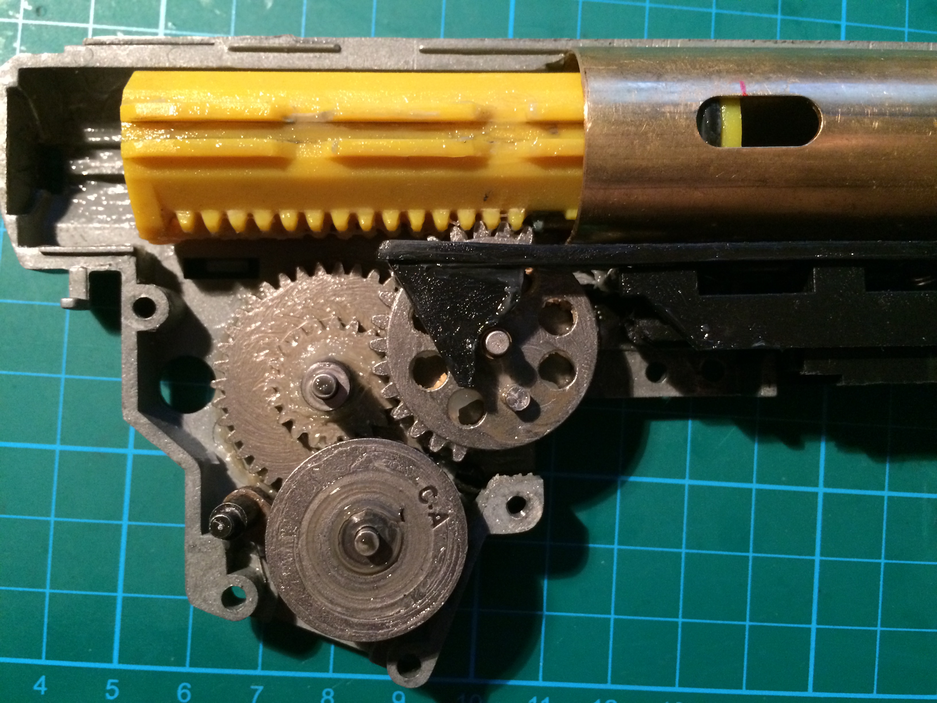 Po X letech jsem vytáhl starou CA36C a chtěl jsem ji znovu rozchodit. Koupil jsem novou pružinu, hopup gumičky, baterku(9,6V) a očekával jsem, že po výměně bude vše šlapat jako hodinky, leč opak byl pravdou. Po výměně pružiny základní (cca M100 prý) na M130 mi motorek ani nehnul s pístem. Udělalo to takový zvuk jako bude v následujícím videu a konec (zvuk je způsoben snahou motorku otočit se s tím, že se neotočí pastorek ale tělo motoru). Pořídil jsem tedy pružinu M120 - pokrok, kvér vystřelil, tak jsem se těšil že to je v cajku, jenže po pár výstřelech se zasekl v cca 95% natažení a poslední 3 zoubky dělal to samé jako při M130 - viz video: https://youtu.be/qiqurCs8YSA Na fotkách přikládám stav, v jakém se kvér vždy zasekl.