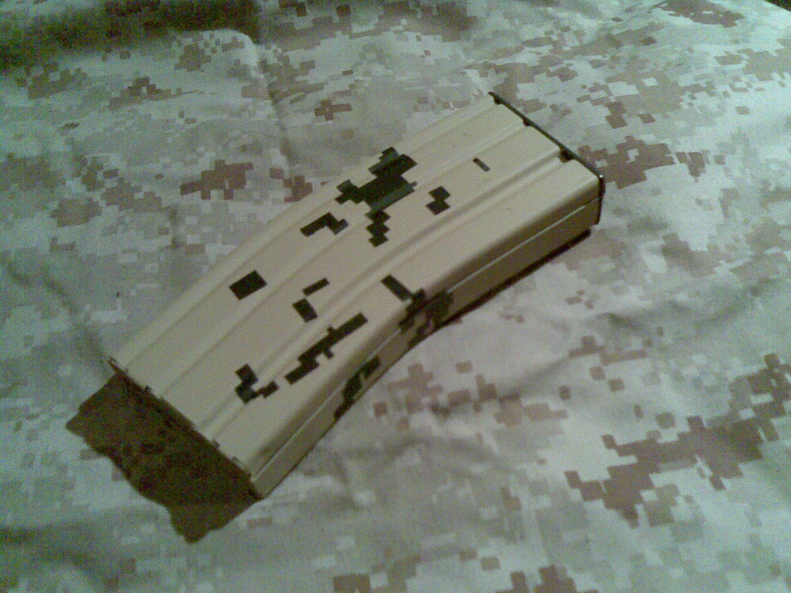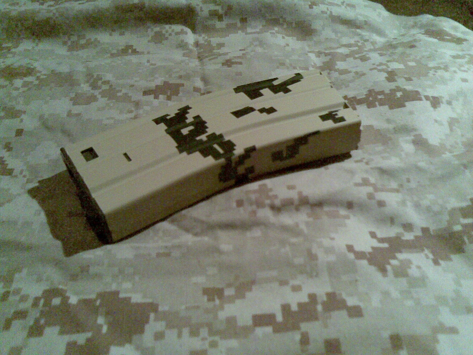 Zdravím, dnes bych potřeboval poradit , protože se nejedná o můj kvér.Jeden z teamu mi přinesl plechovku Krylonu (sand) a řekl, že chce celou zbraň klidně bez jakéhokoliv vzoru nastříkat, jestliže budu chtít, ať udělám nějaký vzor. Na test jsem si stříknul jeden starý rohlík. Ale nevím nevím. Příloha:
