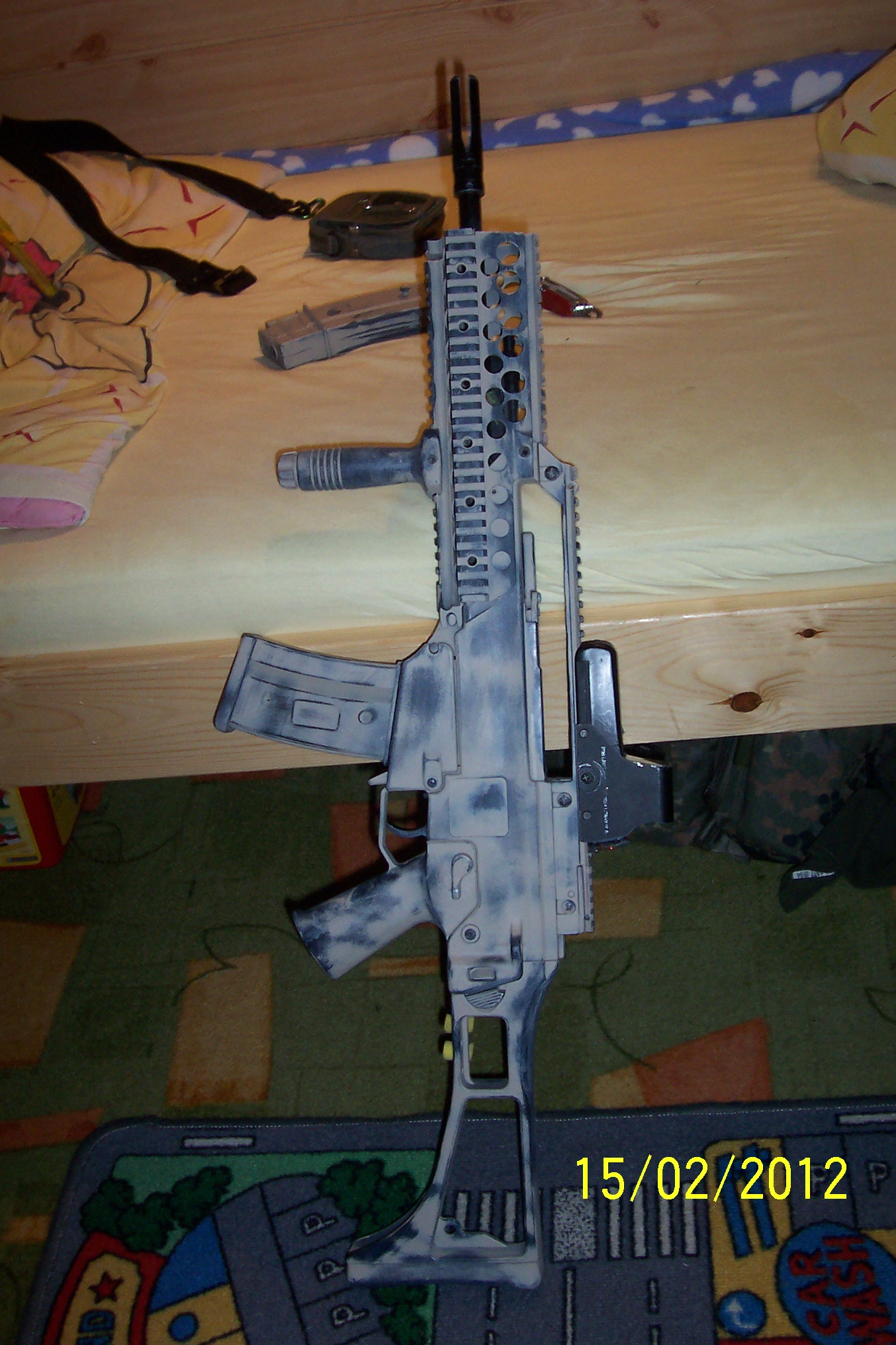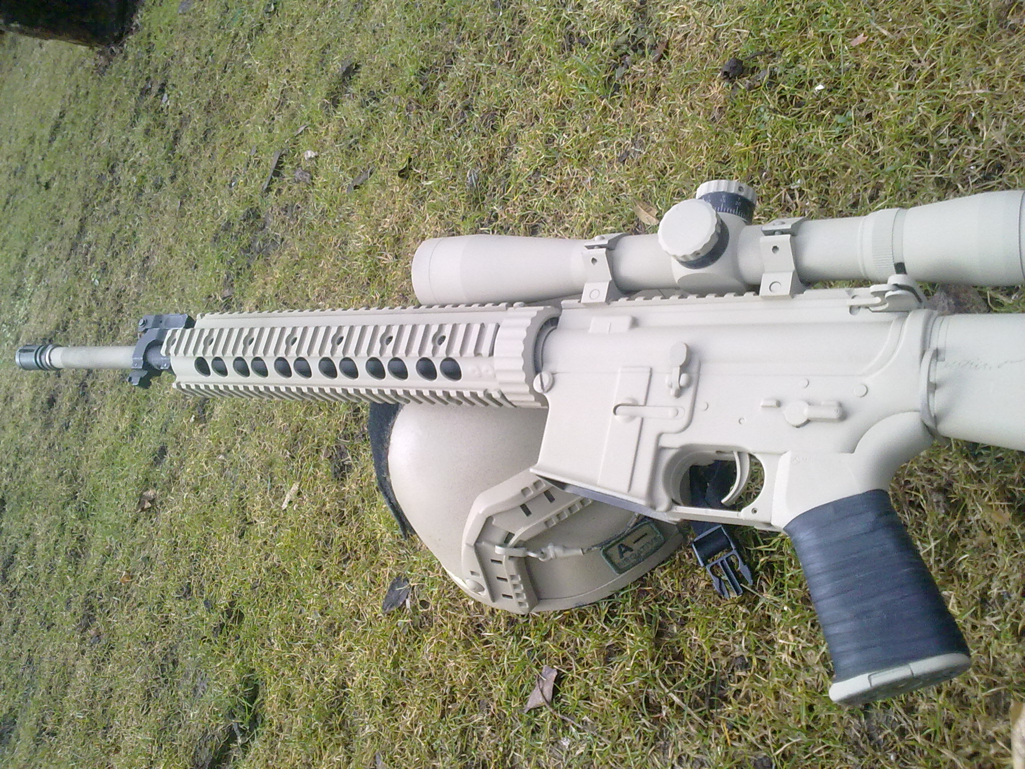 Hmmm, mám slušnej odhad Taky jsme s tím dlouho zápasily, je dobrý to fotit pokud možno kolmo, protože pak se ti do toho neodráží obloha. On je ten sprej sice matnej, ale je matnej až tak moc, že takovým zvláštním způsobem odráží světlo a dělá z něj šedou (což je fajn, šedá je krutě účinná maskovací barva ikdyž si obecně nalháváme opak). Ještě mě napadá jestli jsi to nefotil těsně po nástřiku, řekněme ve stejnej, nebo následující den, zkus týden počkat a pak to vyfotit znovu, mohlo by to pak být lepší. Podle stínů odhaduju že bylo pod mrakem a to taky nebejvá dobrý, když je slunko, tak se to fotí líp, barvy jsou reálnější, případně fotit když je slunko ale zbraň mít ve stínu. Plus samozřejmě správně nastavený vyvážení bílé na foťáku (nejlépe pokud umožňuje manuální korekci pomocí bílýho papíru).