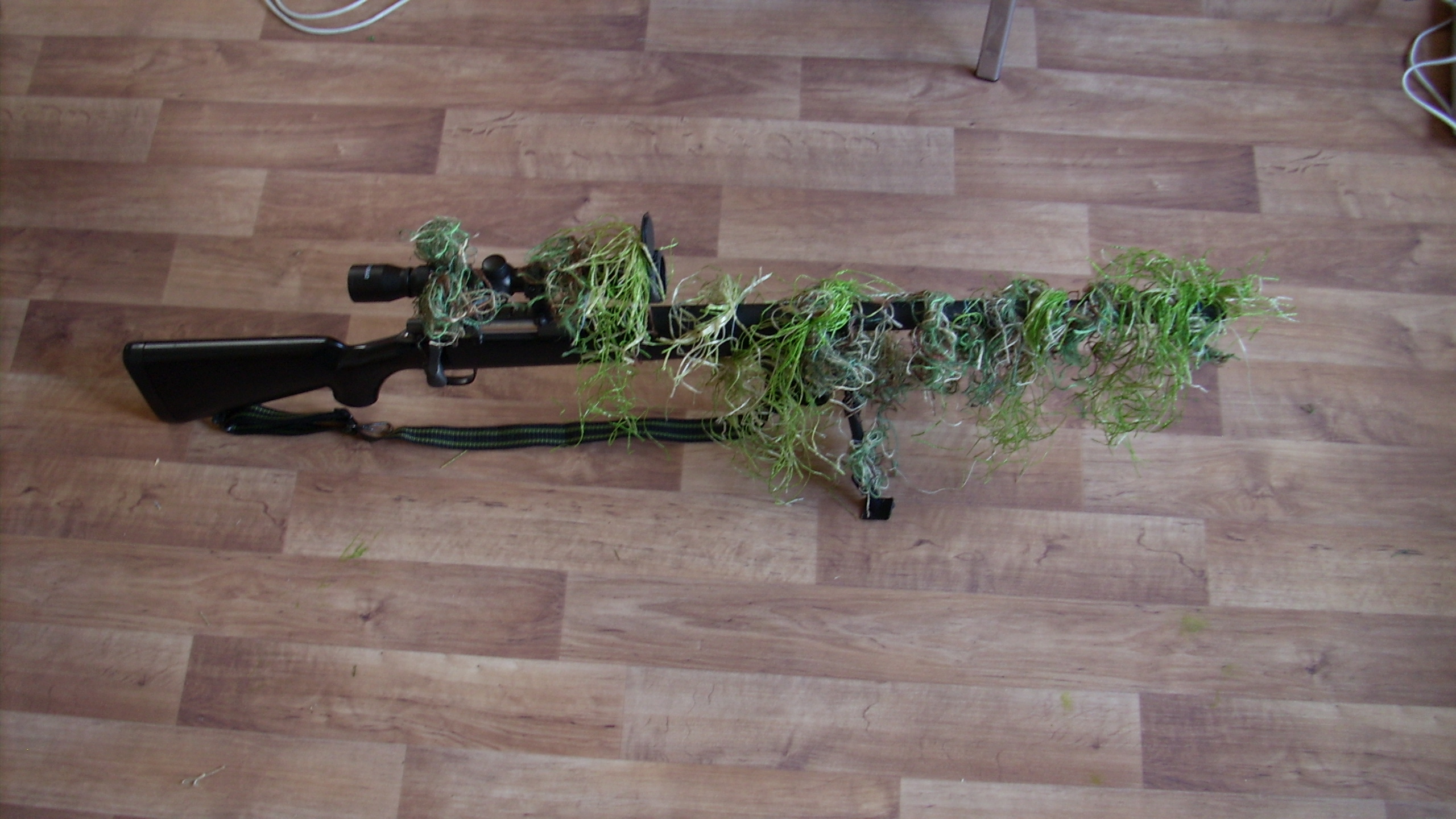 Já používám na maskování zbraňe takovou věc - fintu, jde vlastně o to , že sem si v galantérce koupil cca 3mtak 1-2cm zelené ploché elestické gumy ( něco jako tá cose dáva do tepláku apod.) a udělal to , že sem ji přehnul napůl tím pádem mi vzniklo dvojitá guma o délce 1,5m tu sem pak na obou koncích udělal uzle a pak každých 5cm udělal další uzel po célé délce, tím pádem mi vznikly takové 5cm oka.No celé toto obtáhnu kolem zbraně a za jednotlivé oka dám okolní vegetaci ve které se pohybuju  jednoduché , levné , bez velké práce a efektivní, navíc pokud se člověk přesune z jednoho prostředí do druhého tak může automaticky rychle vyměnit maskování. Nechal jsem se inspirovat tímto videem: http://www.youtube.com/watch?v=cnjdy1TtnH4 posuňte si to na 7 minutu tam to začíná.